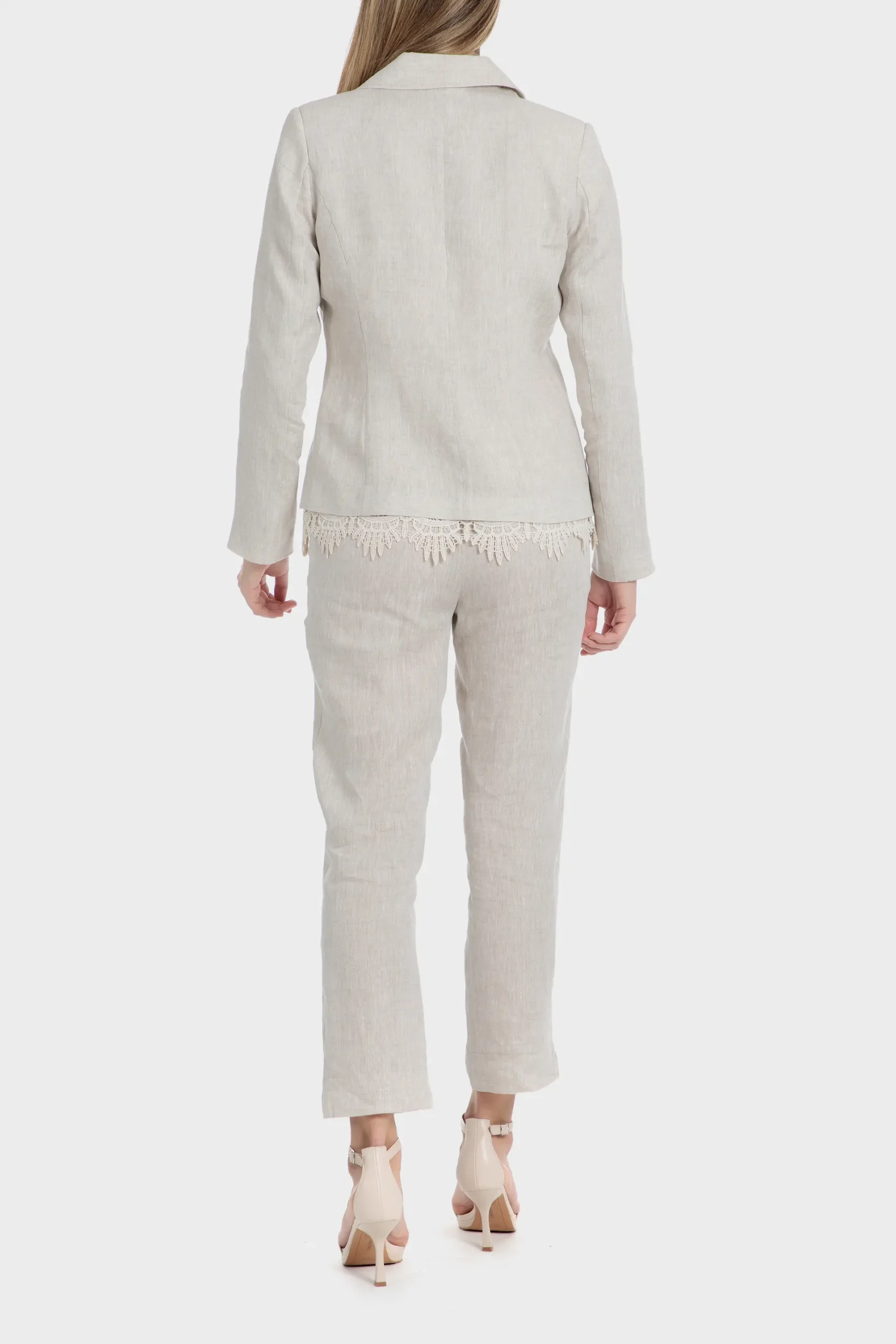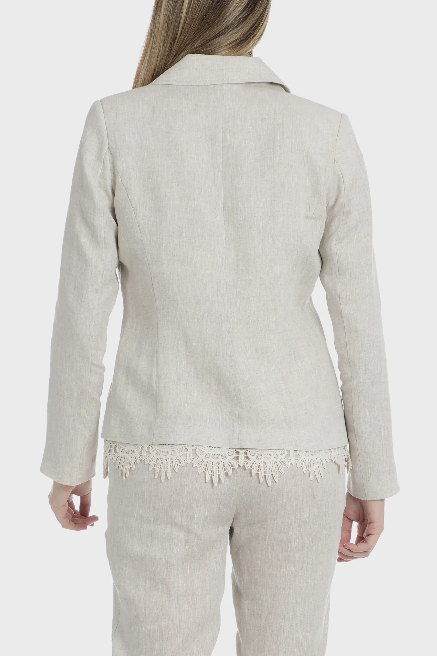 Blazer en lin; coloris beige; manches longues; fermeture boutonnée sur le devant; complétez votre costume avec le pantalon assorti; blazer.