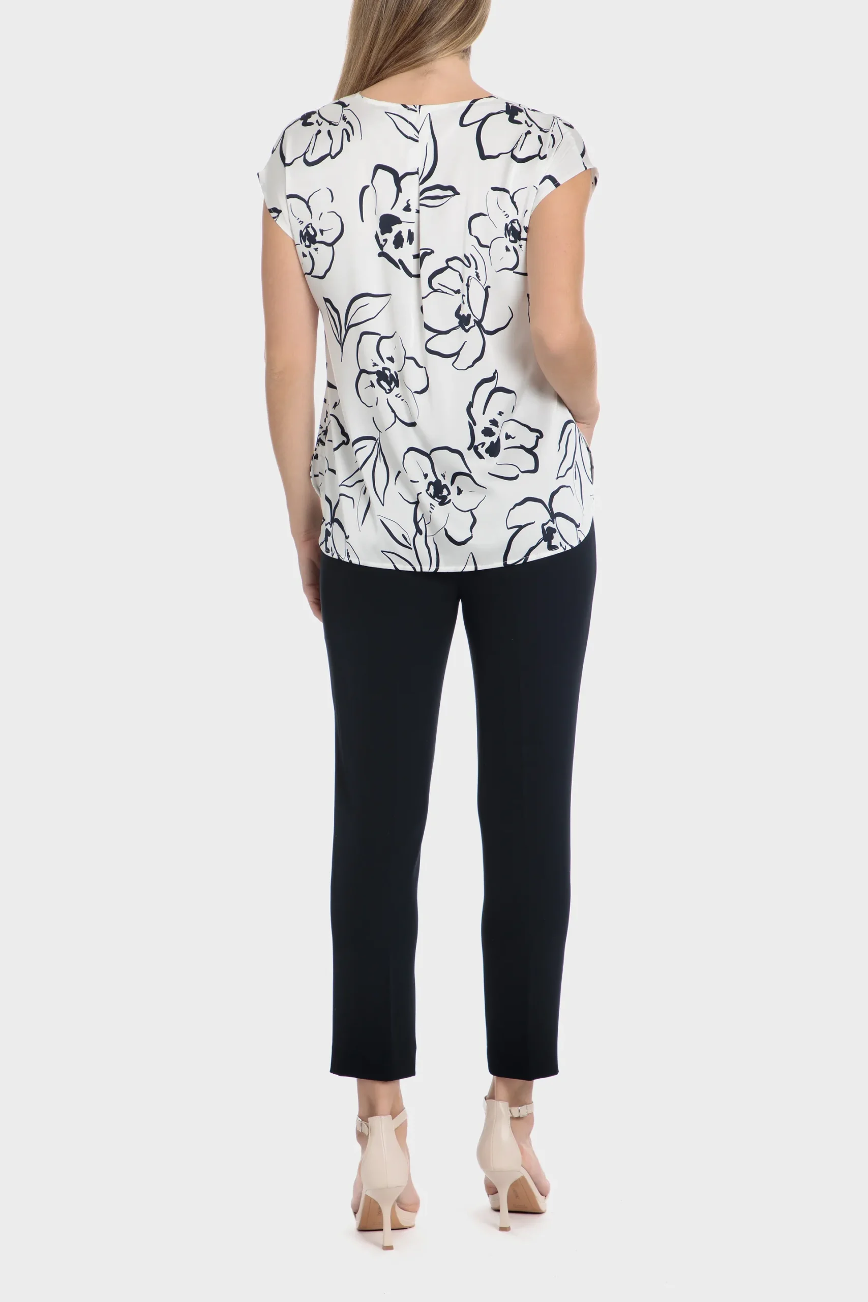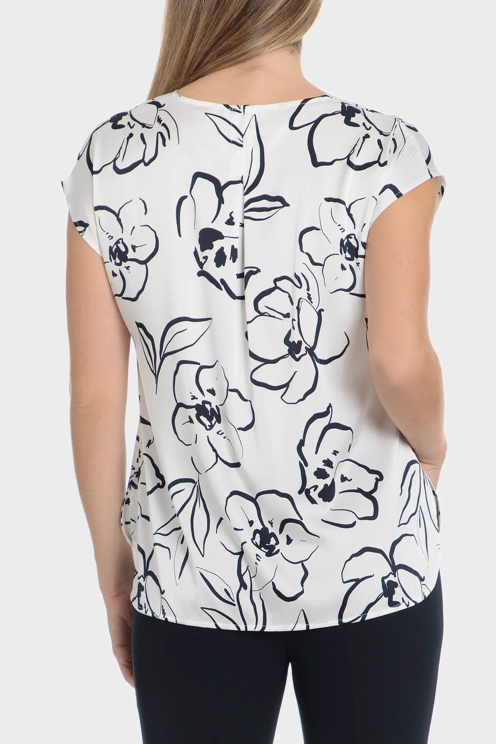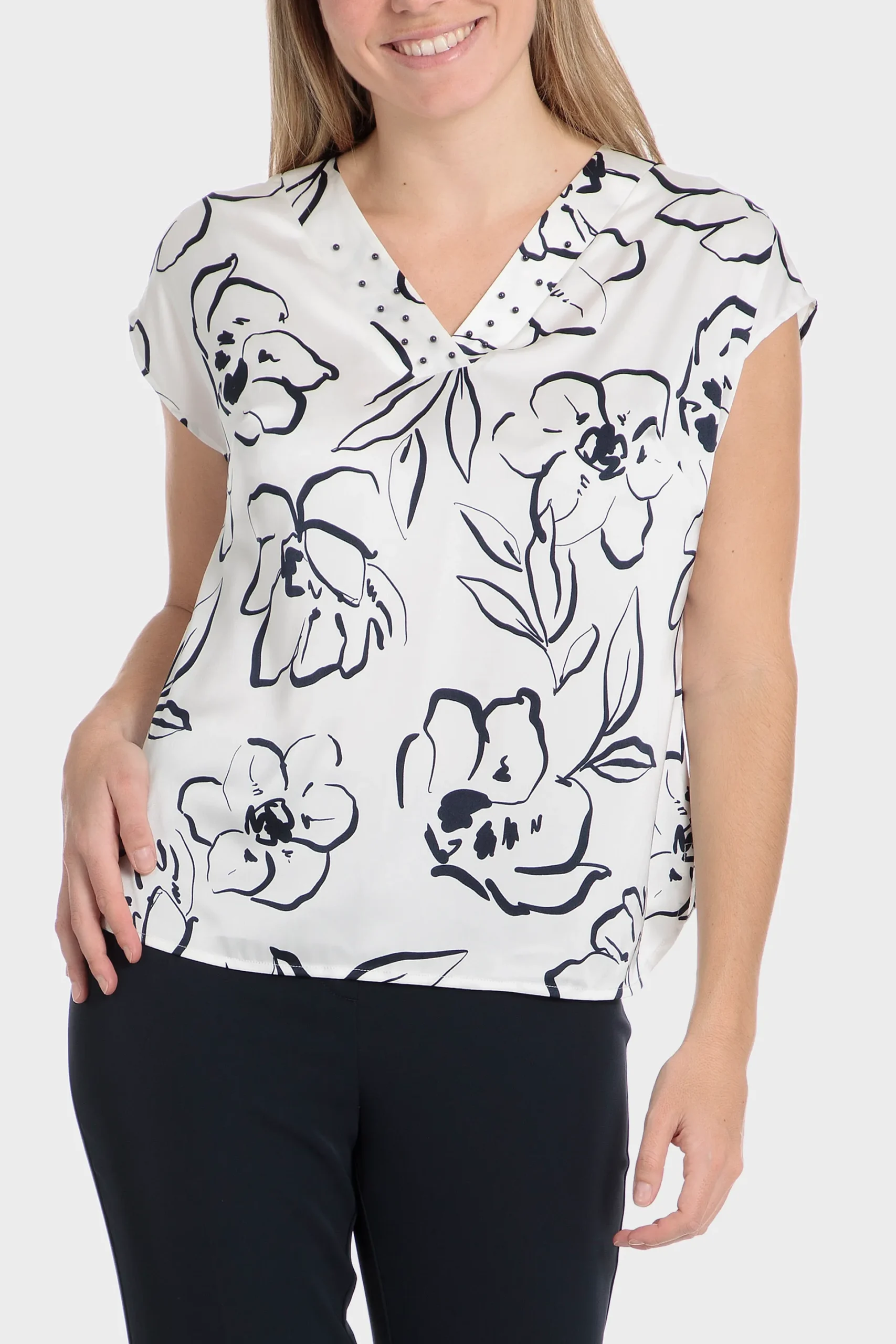 Blouse blanche; imprimé floral; fentes latérales; décolleté en v; manches courtes.