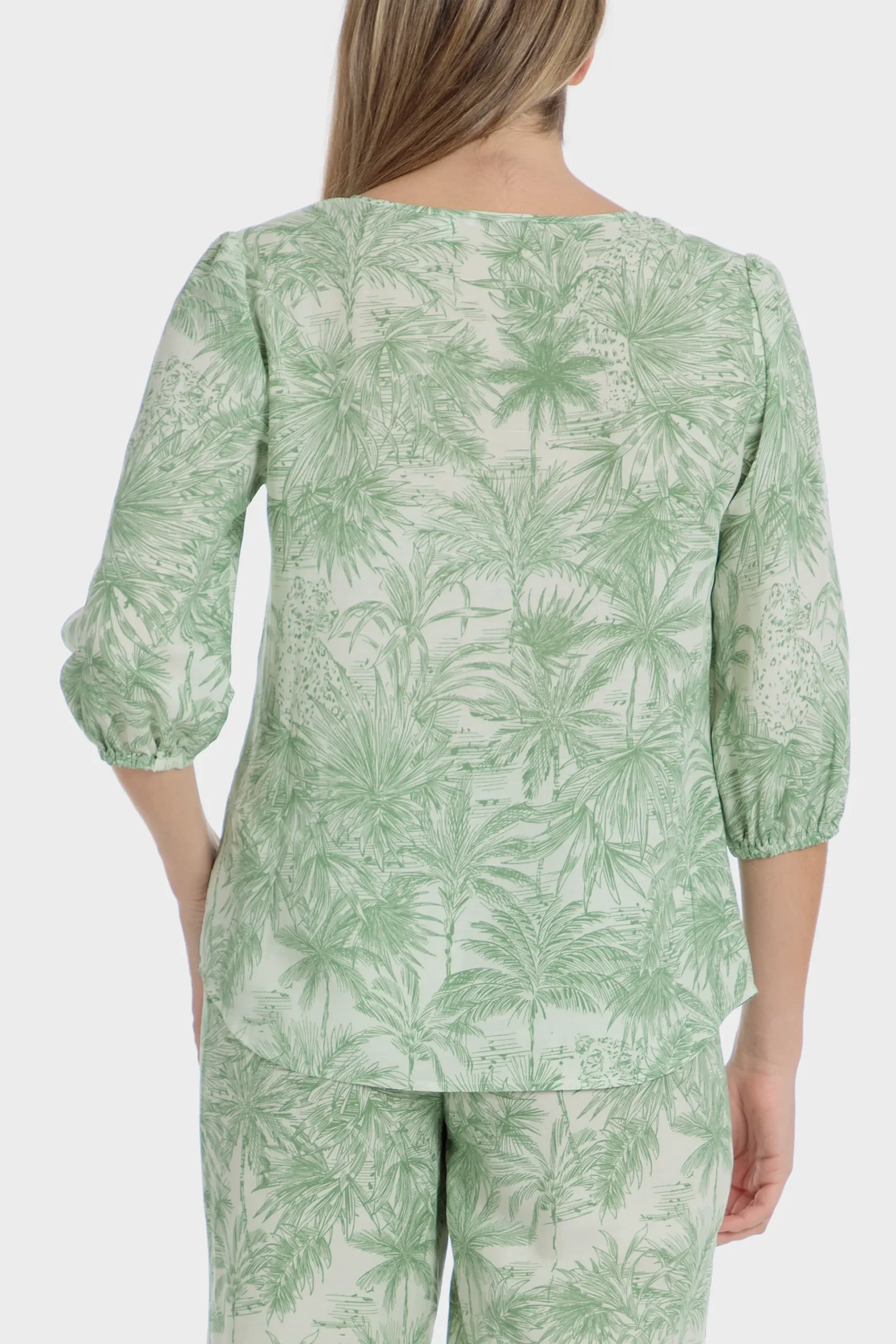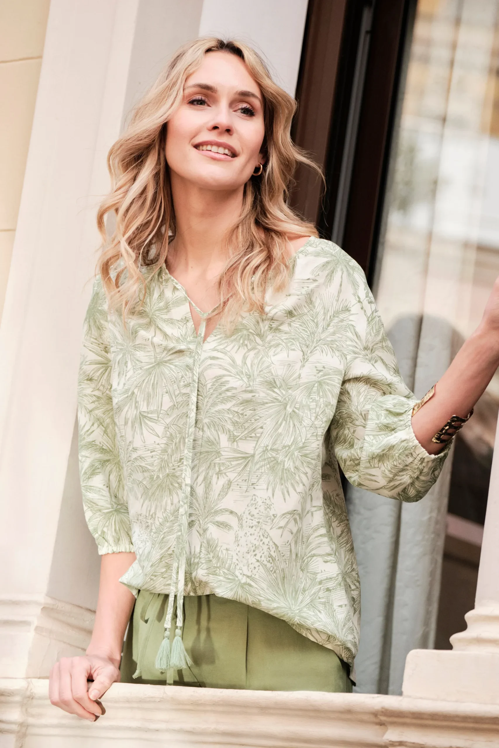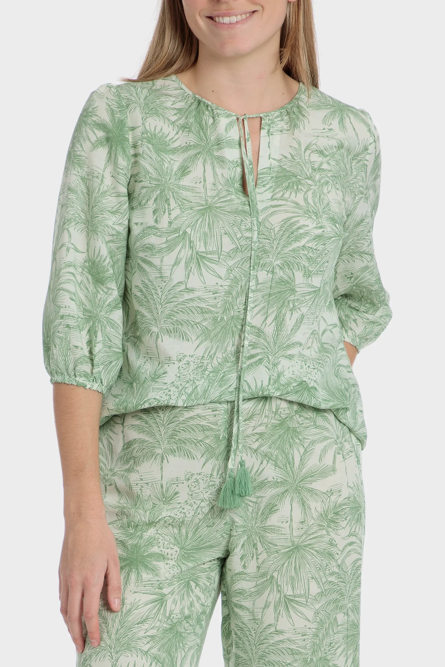 Blouse verte; décolleté larme; cordon terminé par des glands; manches longues et poignets élastiques.