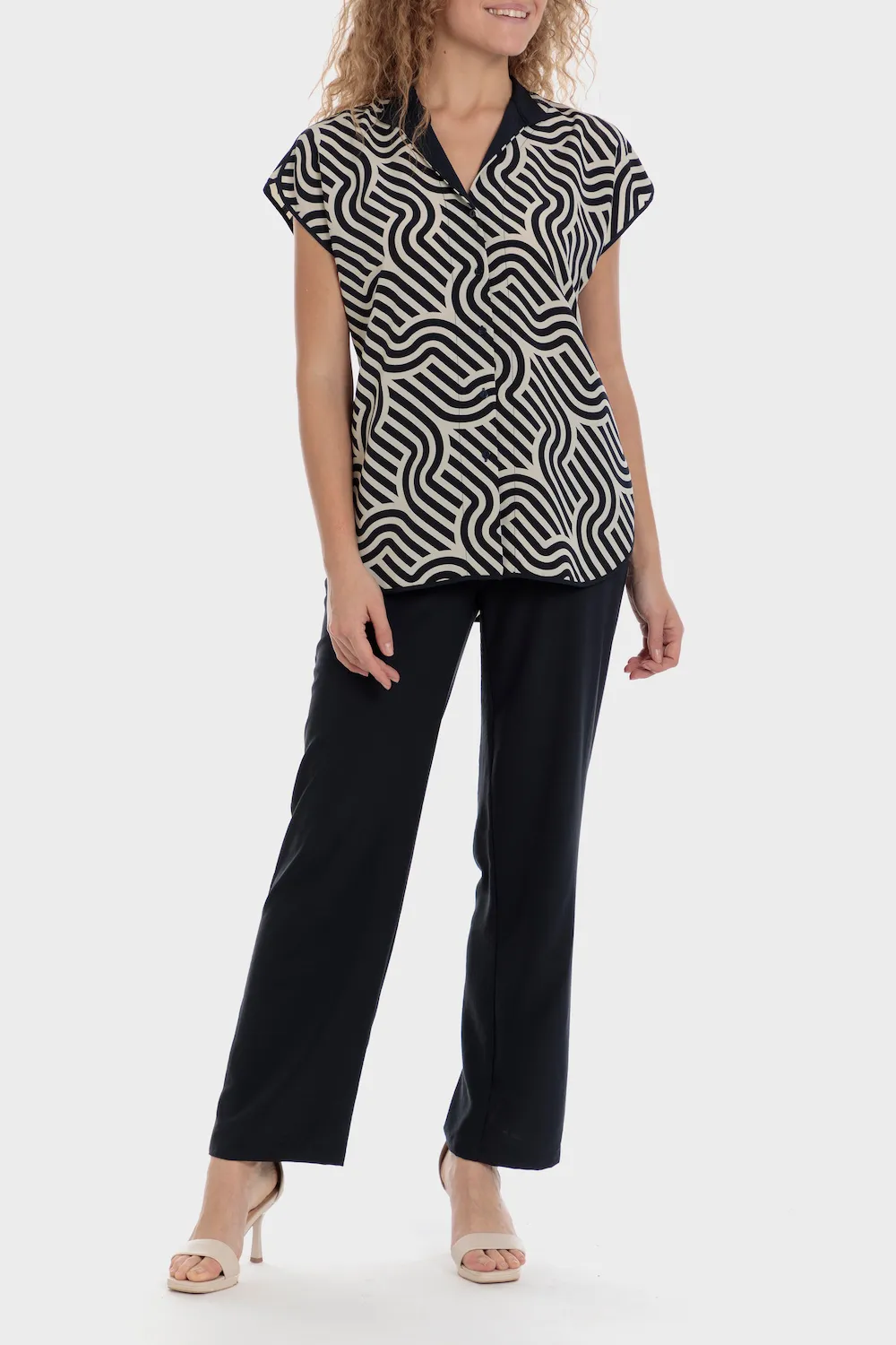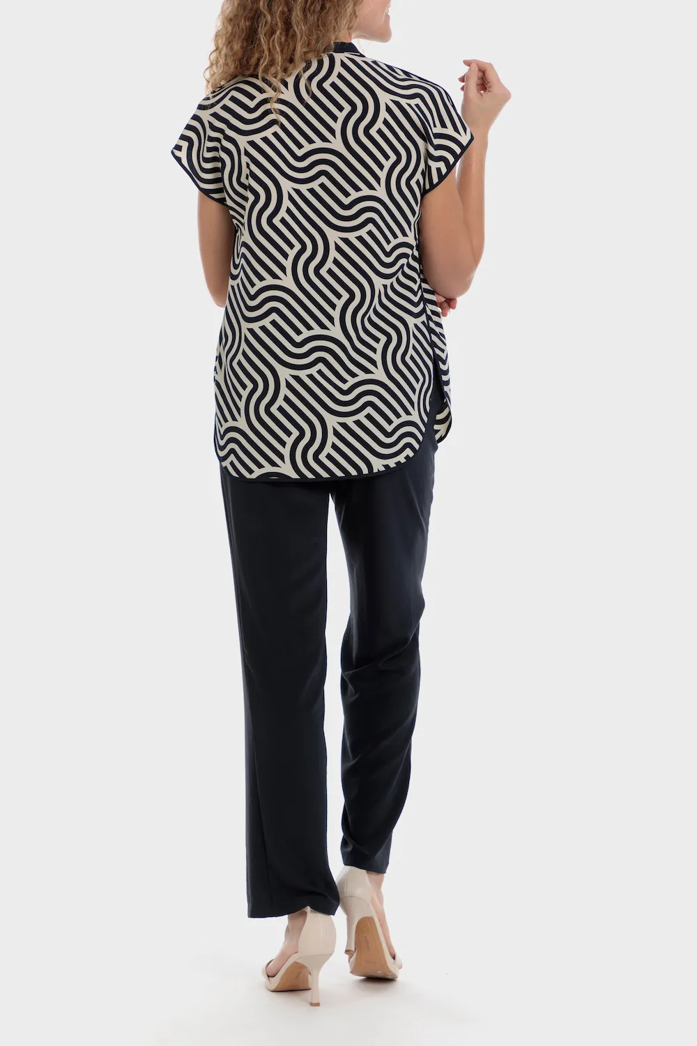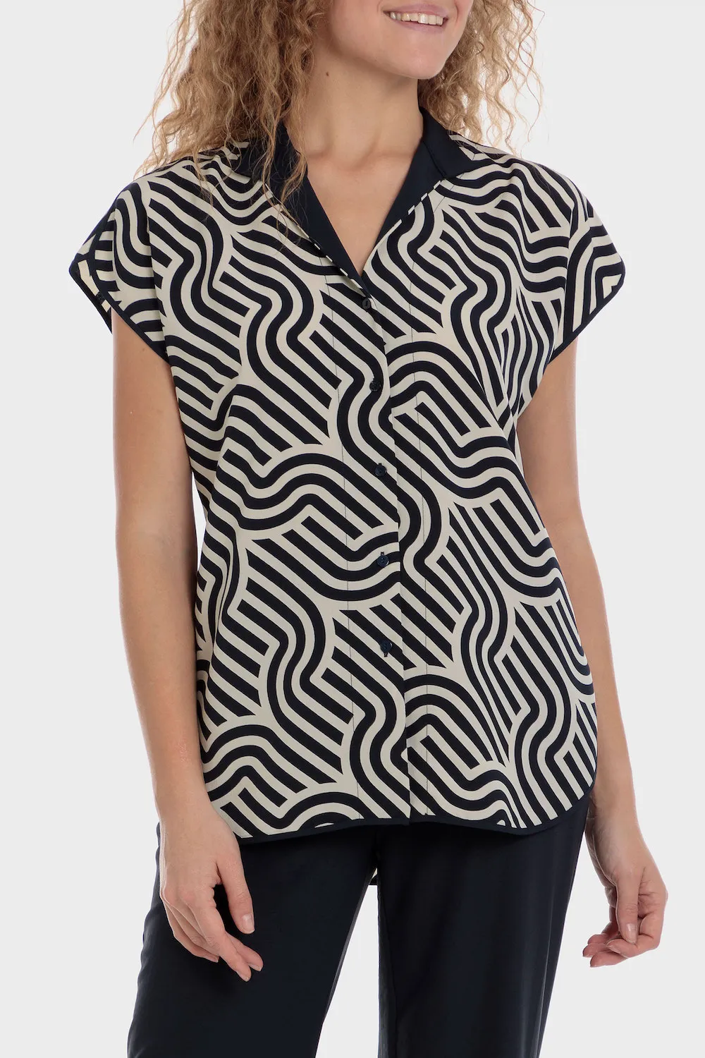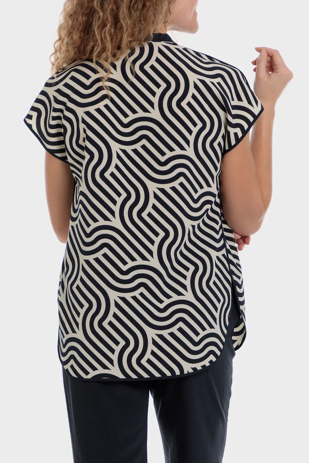 Chemise imprimé géométrique, fentes latérales, décolleté en v, col mao, manches courtes, tissu durable.