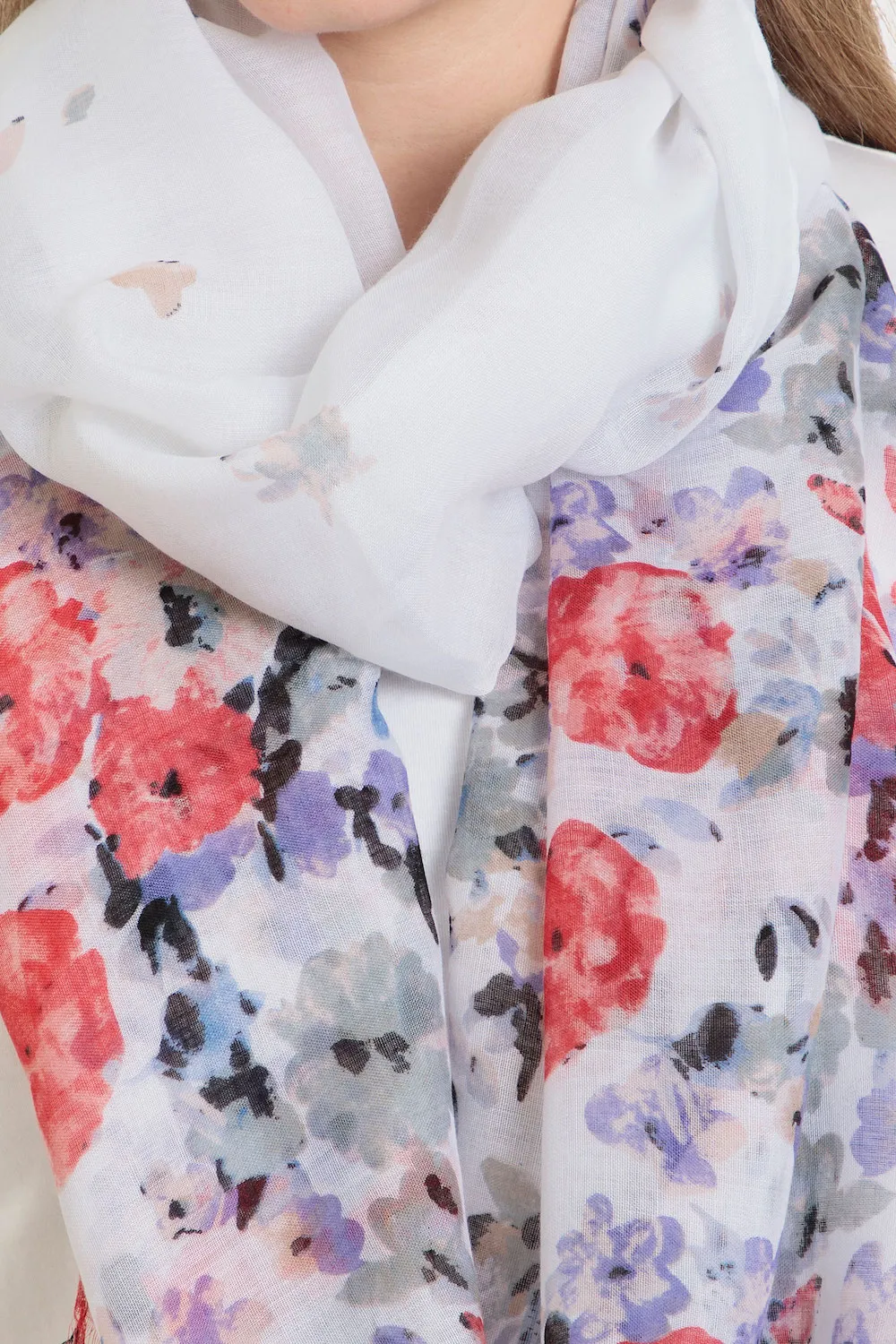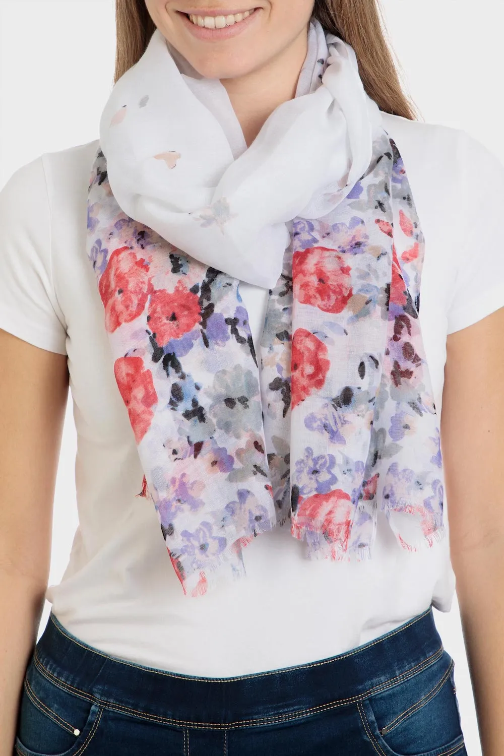 Étole imprimé floral, détails effilochés.
