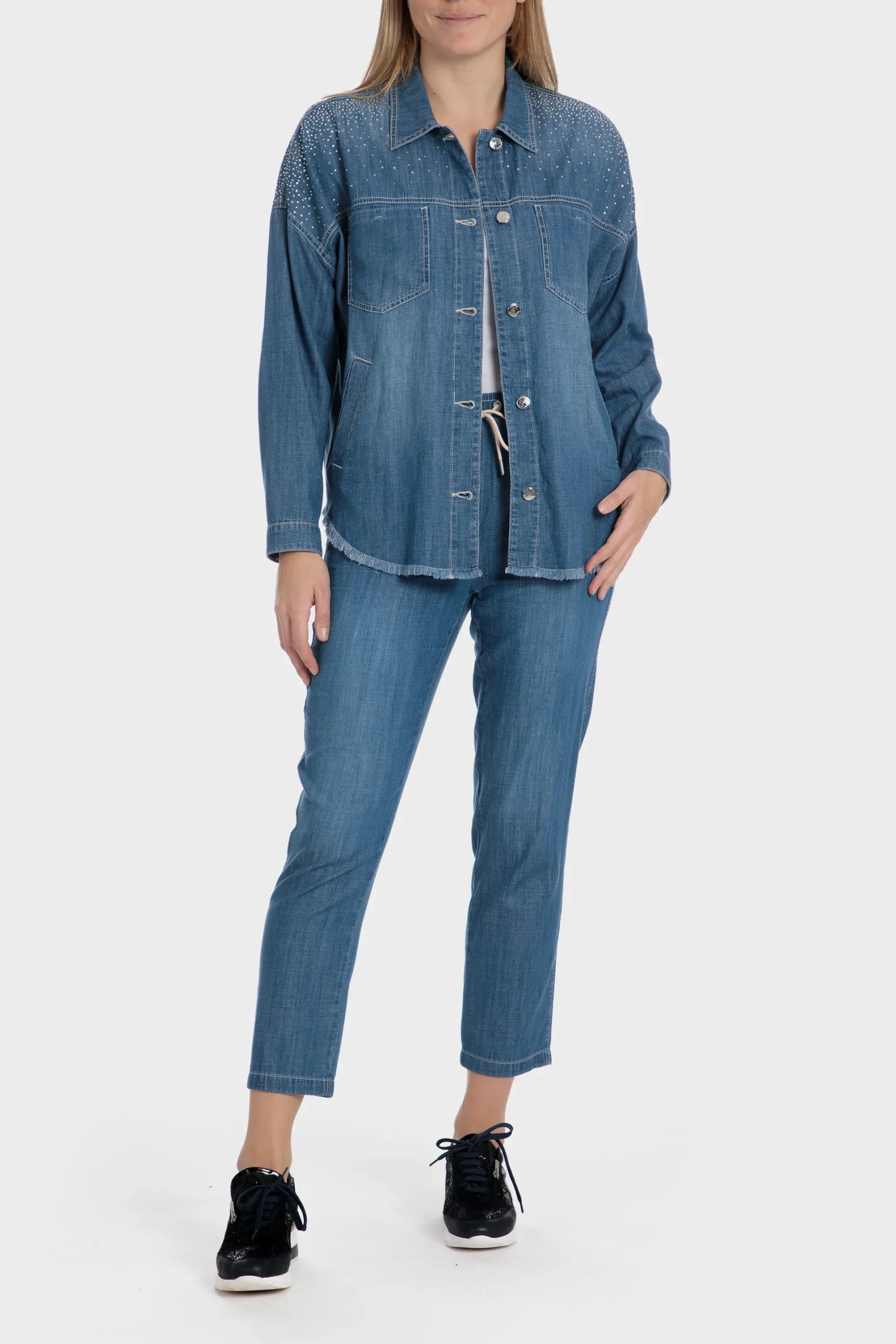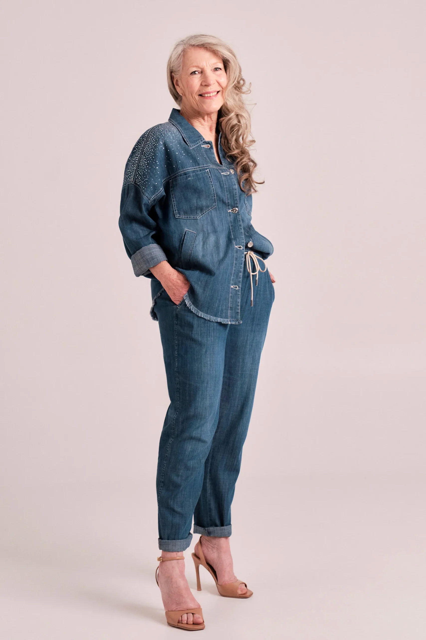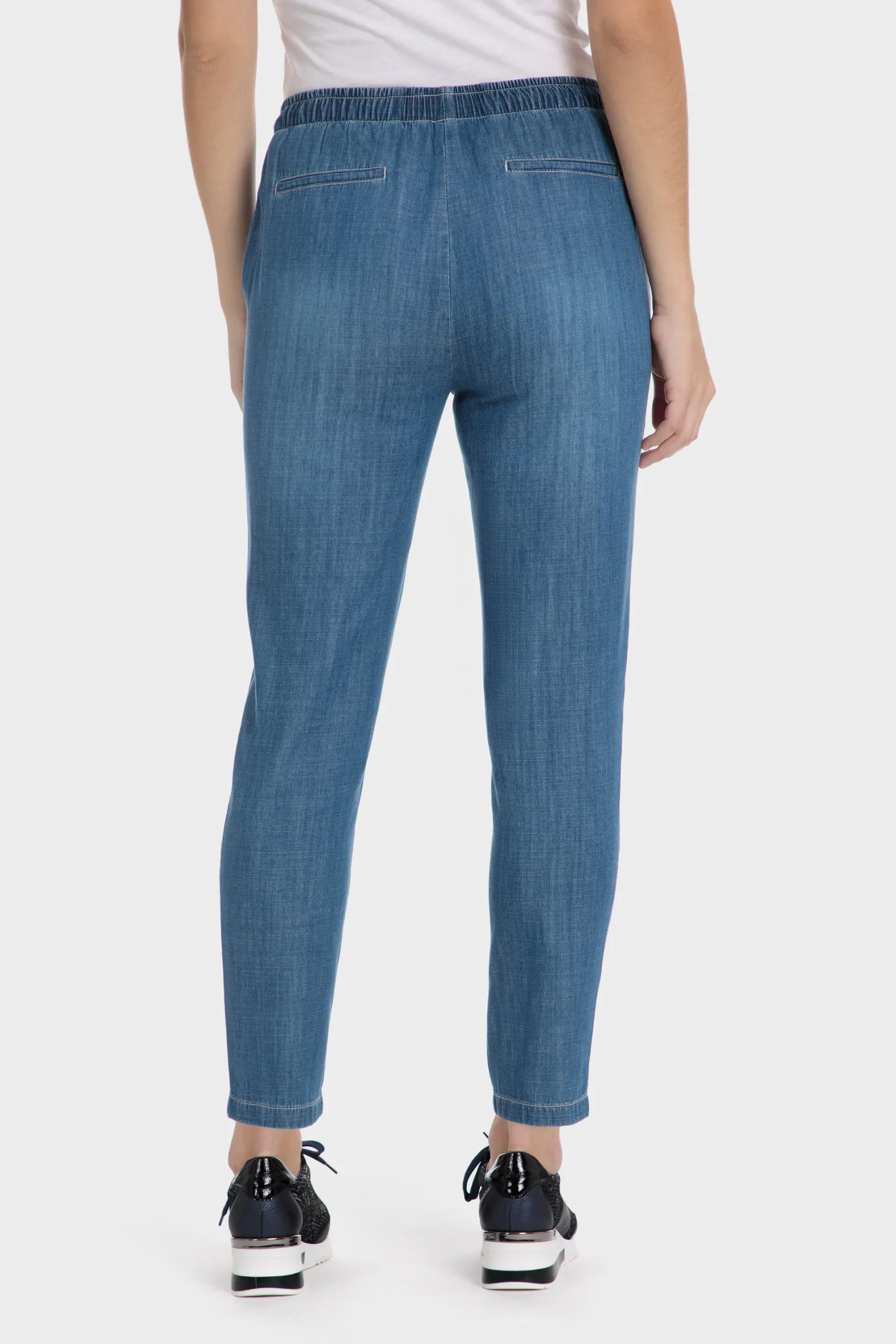 Pantalon chambray; deux poches fendues sur les côtés; taille élastique avec cordon réglable.