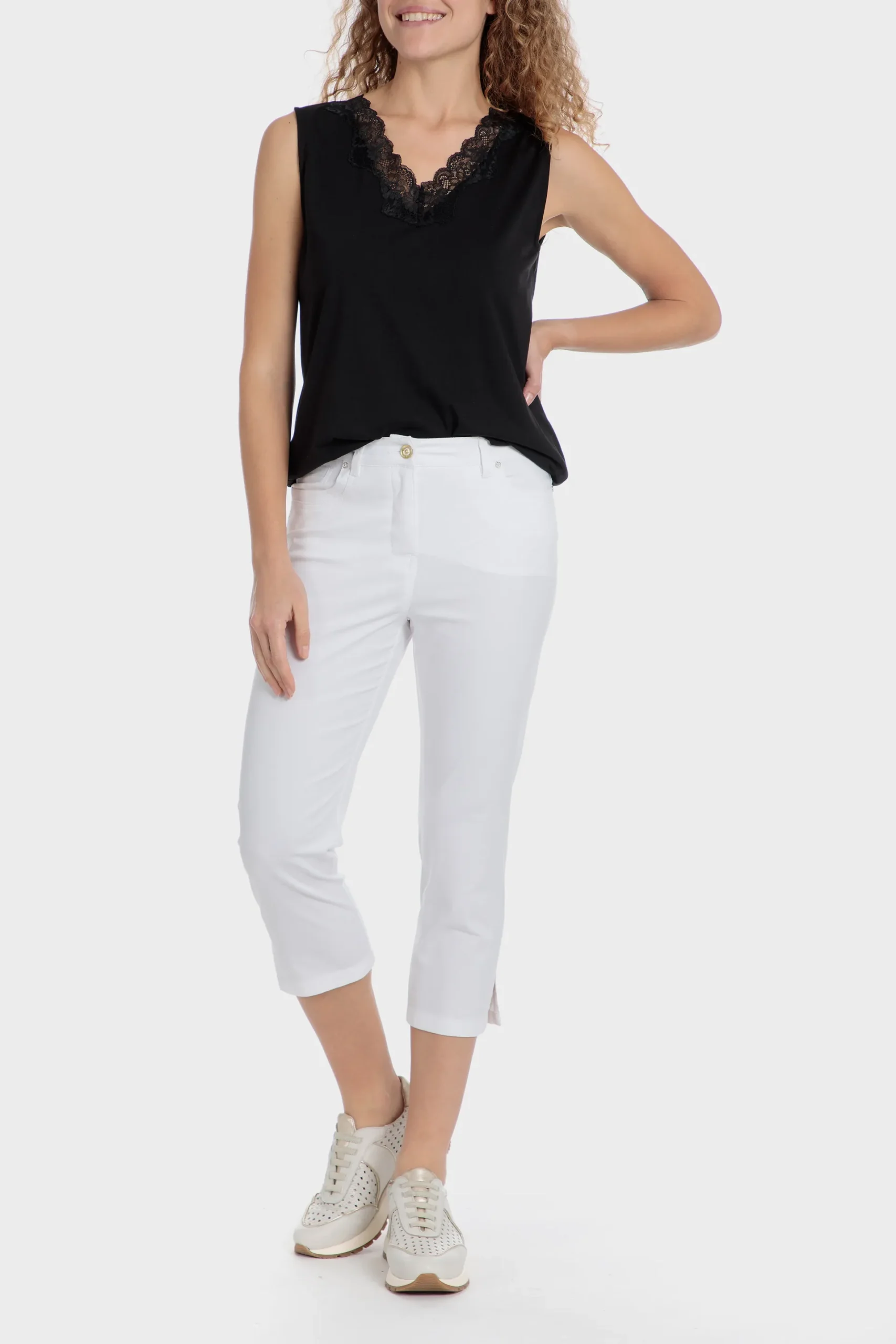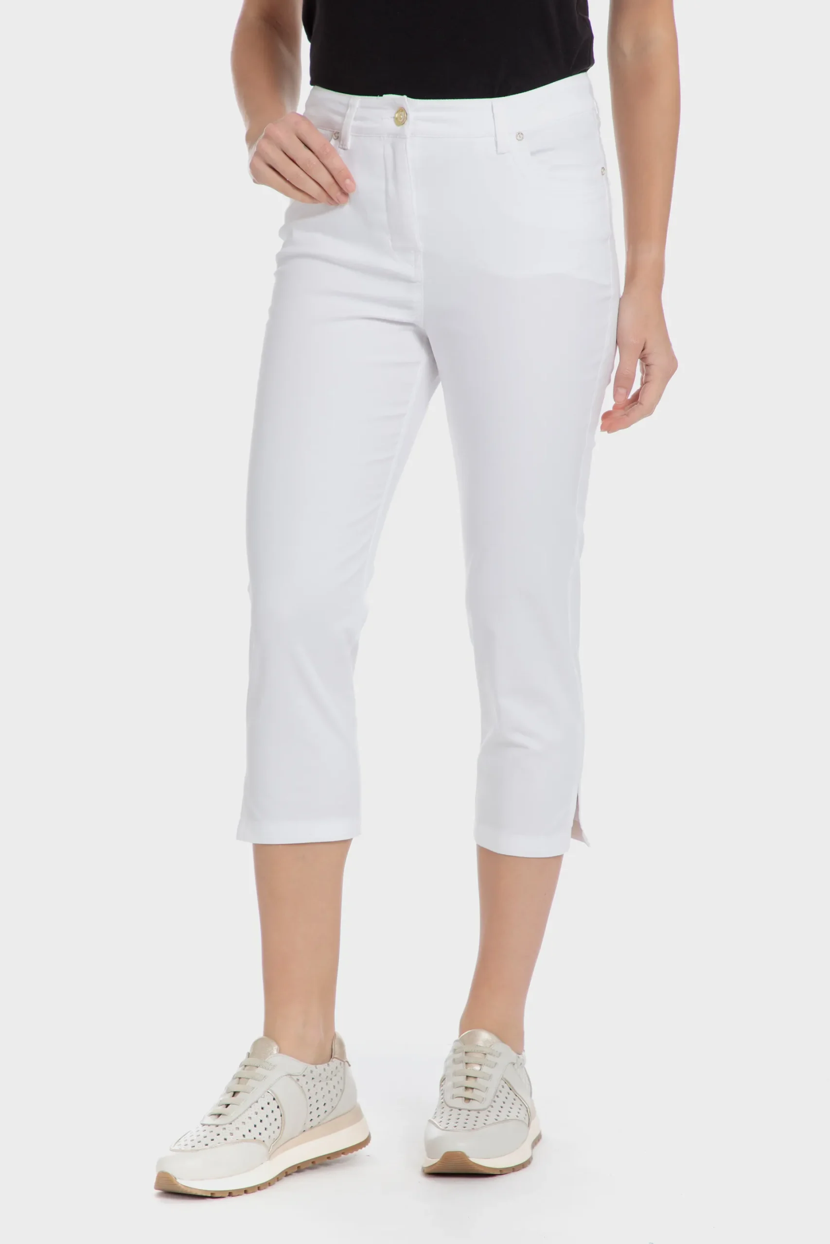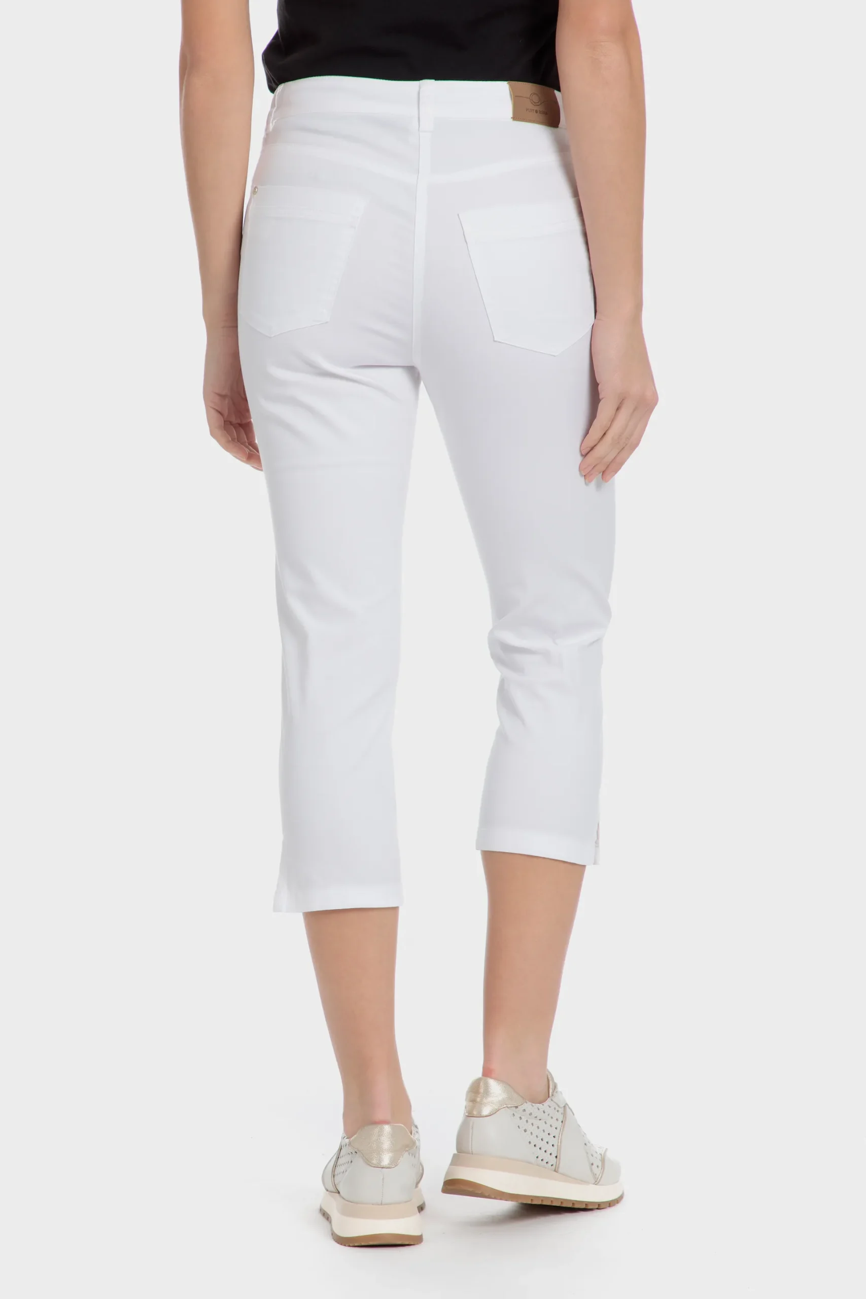 Pantalon corsaire; en coton; passants à la taille; cinq poches; fermeture zippée et bouton. Disponible dans plusieurs couleurs.