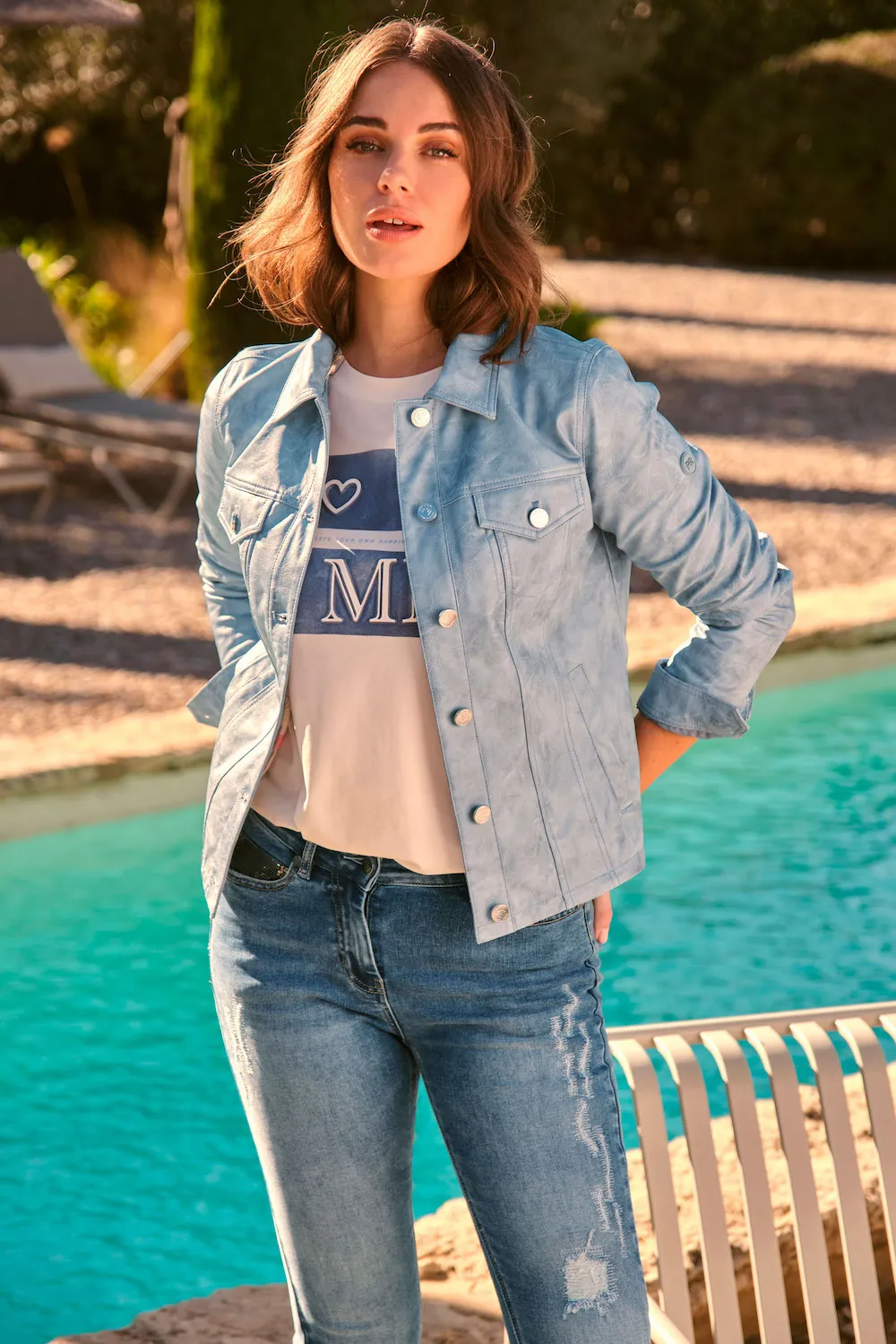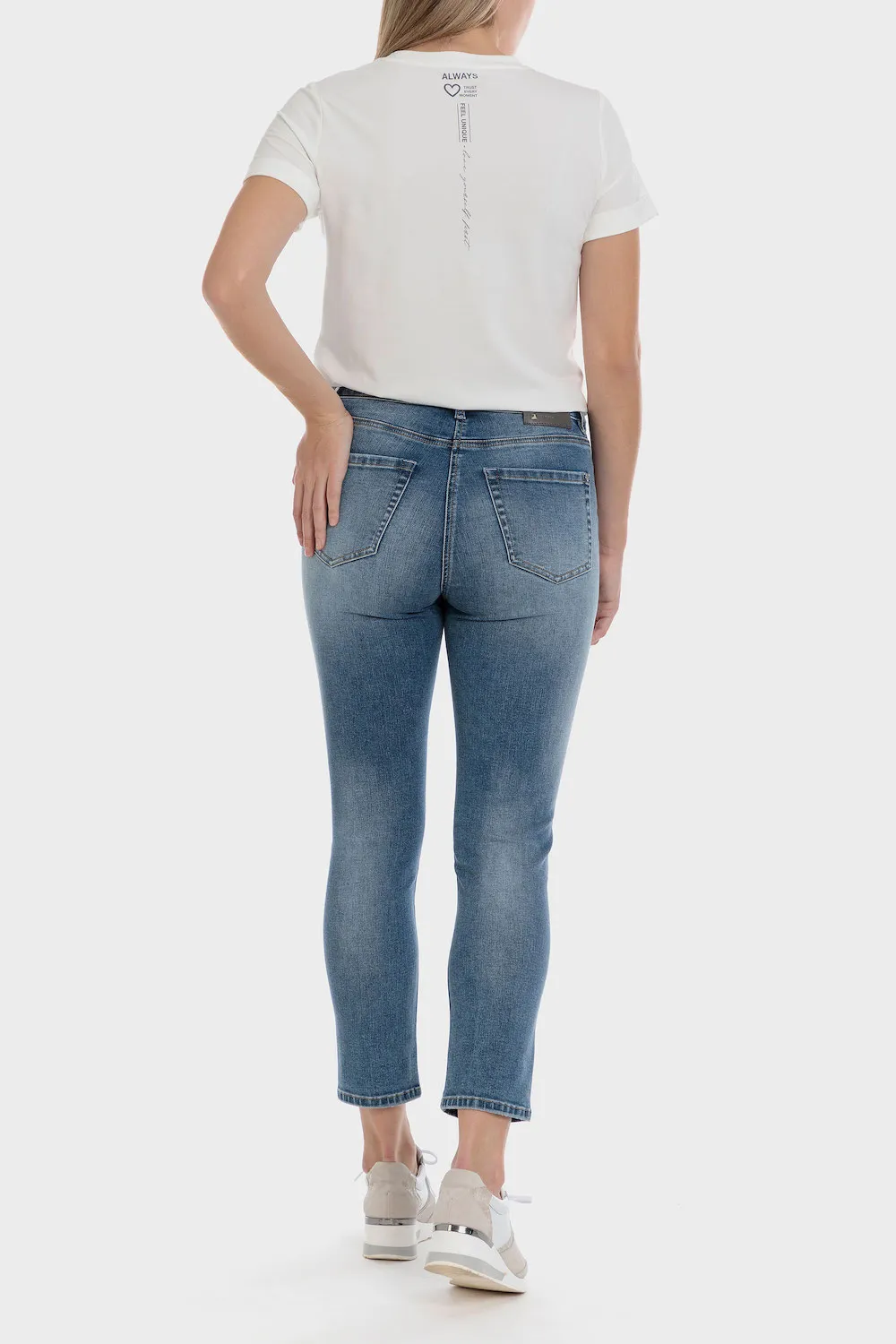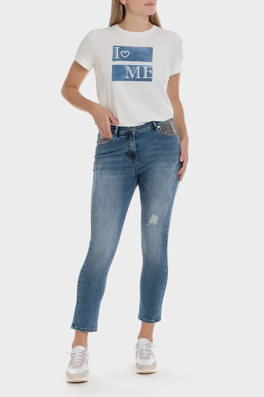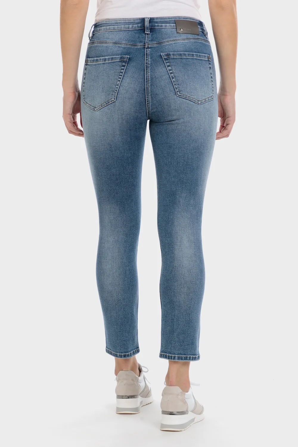 Pantalon denim, détails fantaisie, cinq poches, passants à la taille, fermeture zippée et bouton.