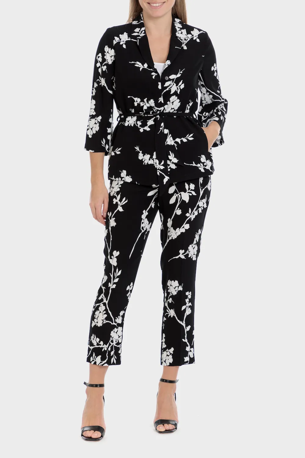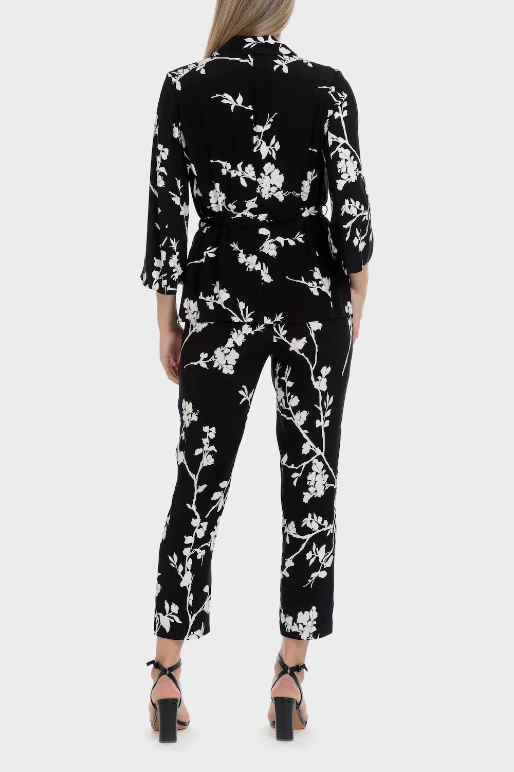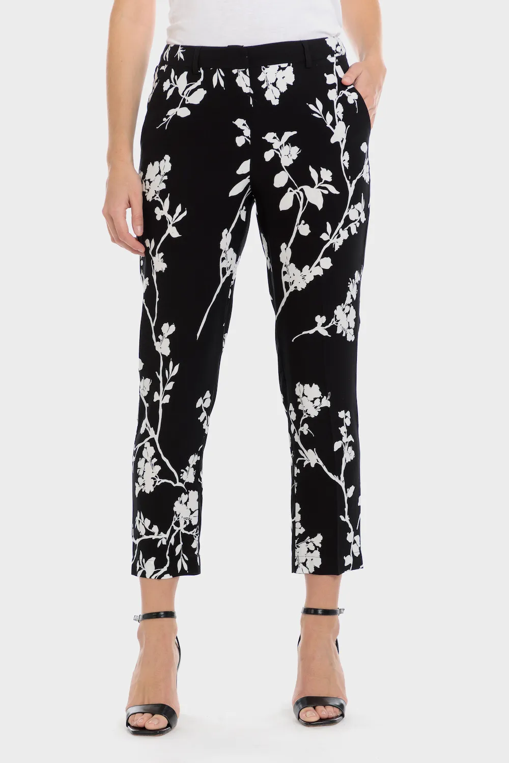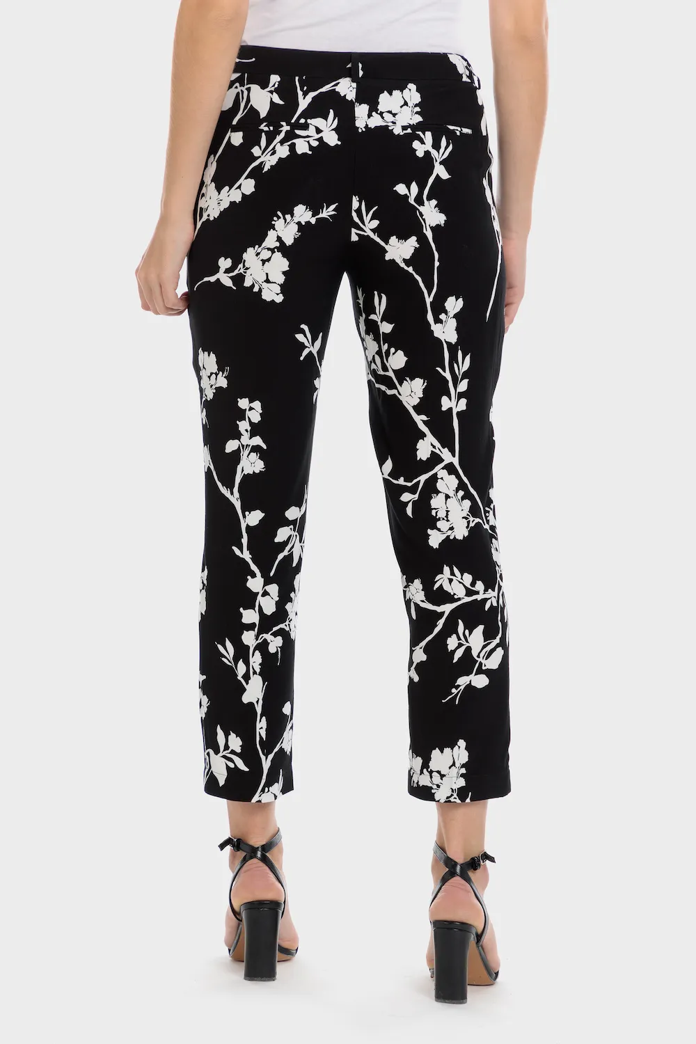 Pantalon imprimé fleurs, quatre poches, passants à la taille, fermeture à glissière et crochets.