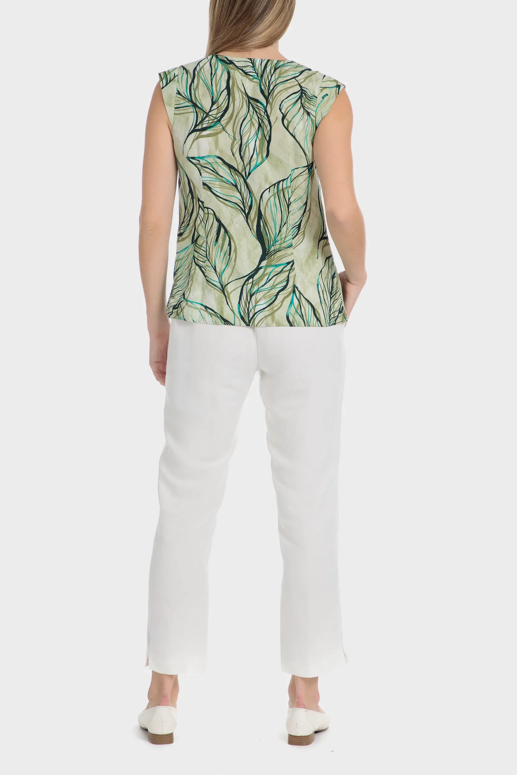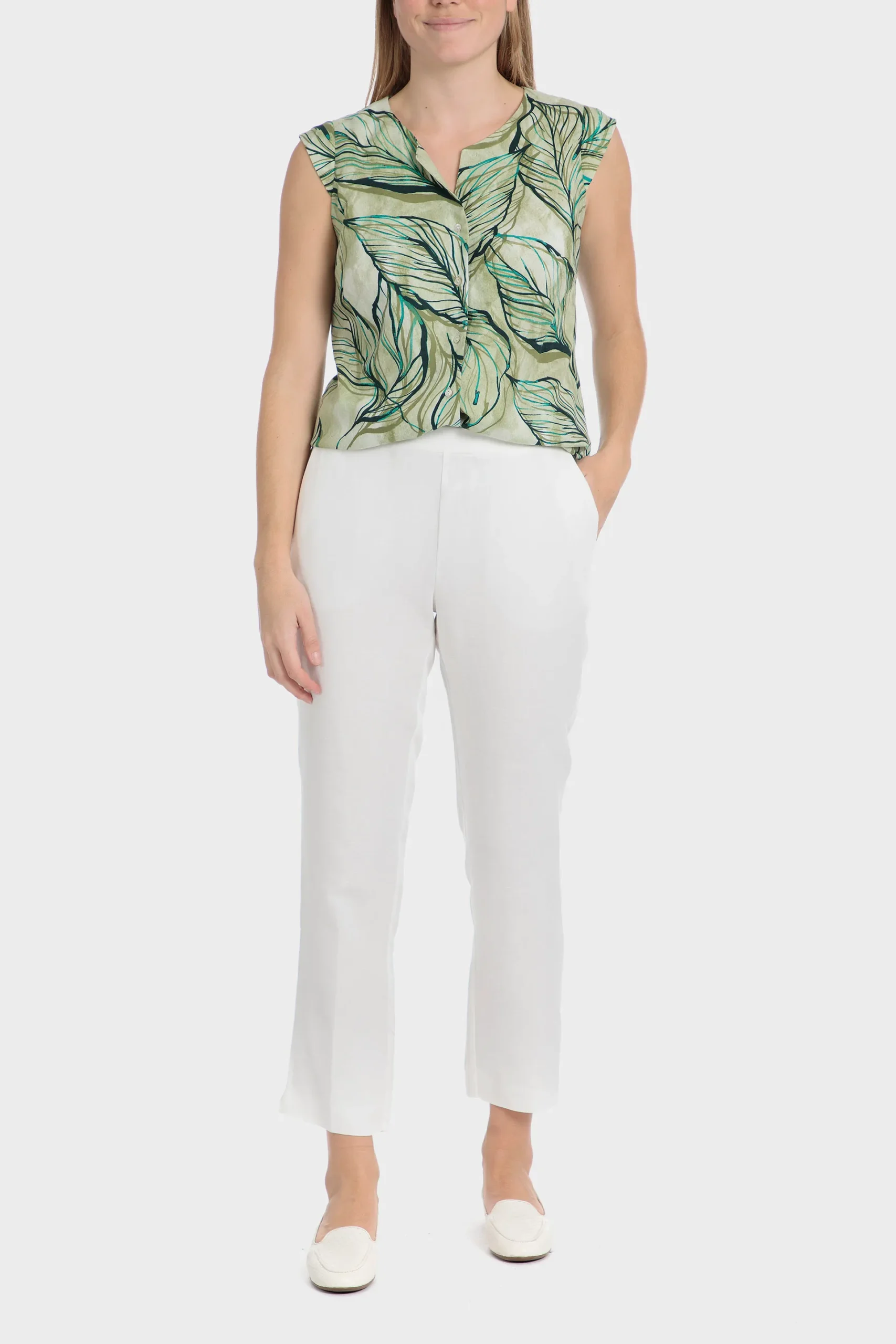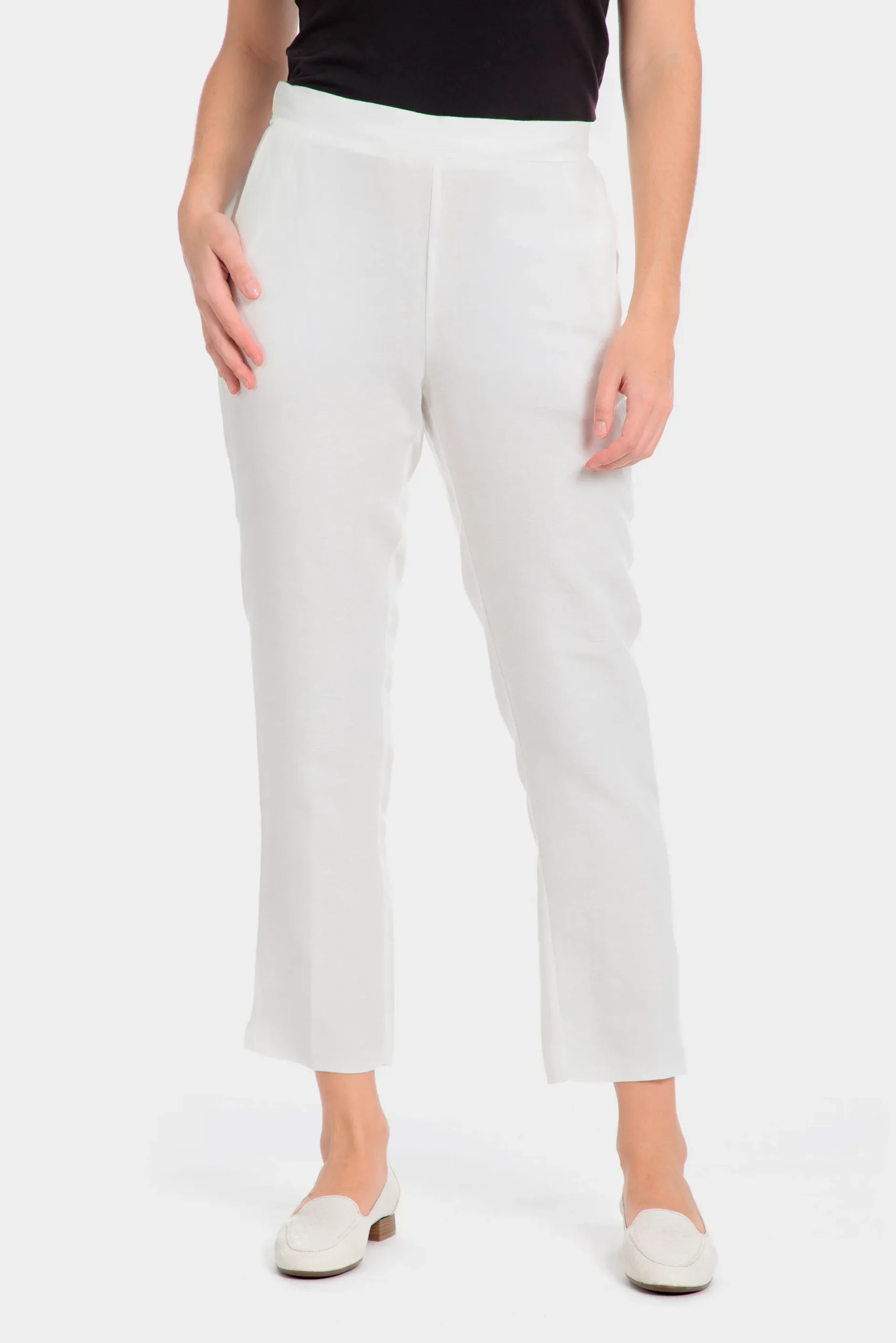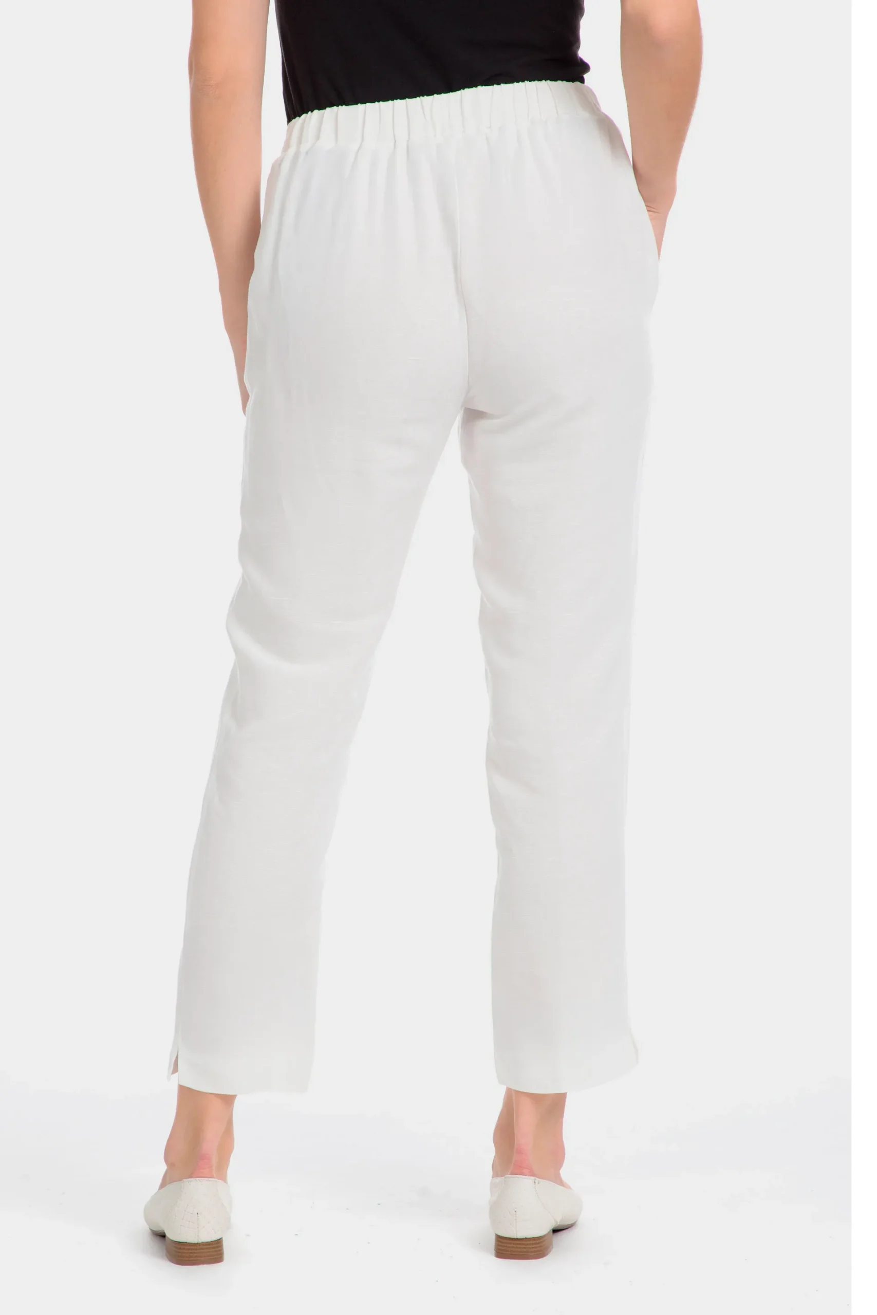 Pantalon blanc; en lin; taille élastique; ouvertures dans le bas; deux poches fendues sur les côtés; complétez votre costume avec le blazer assorti.