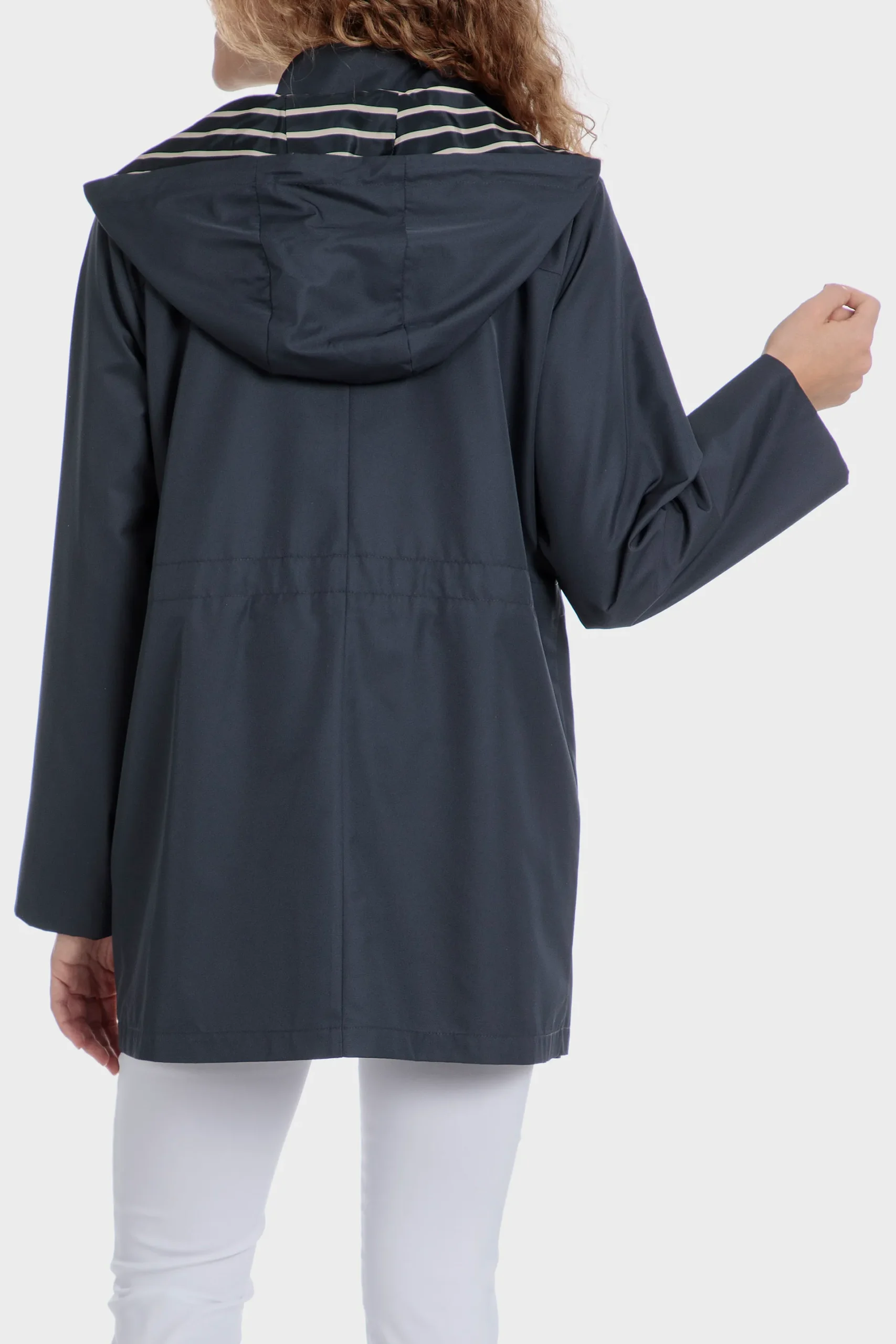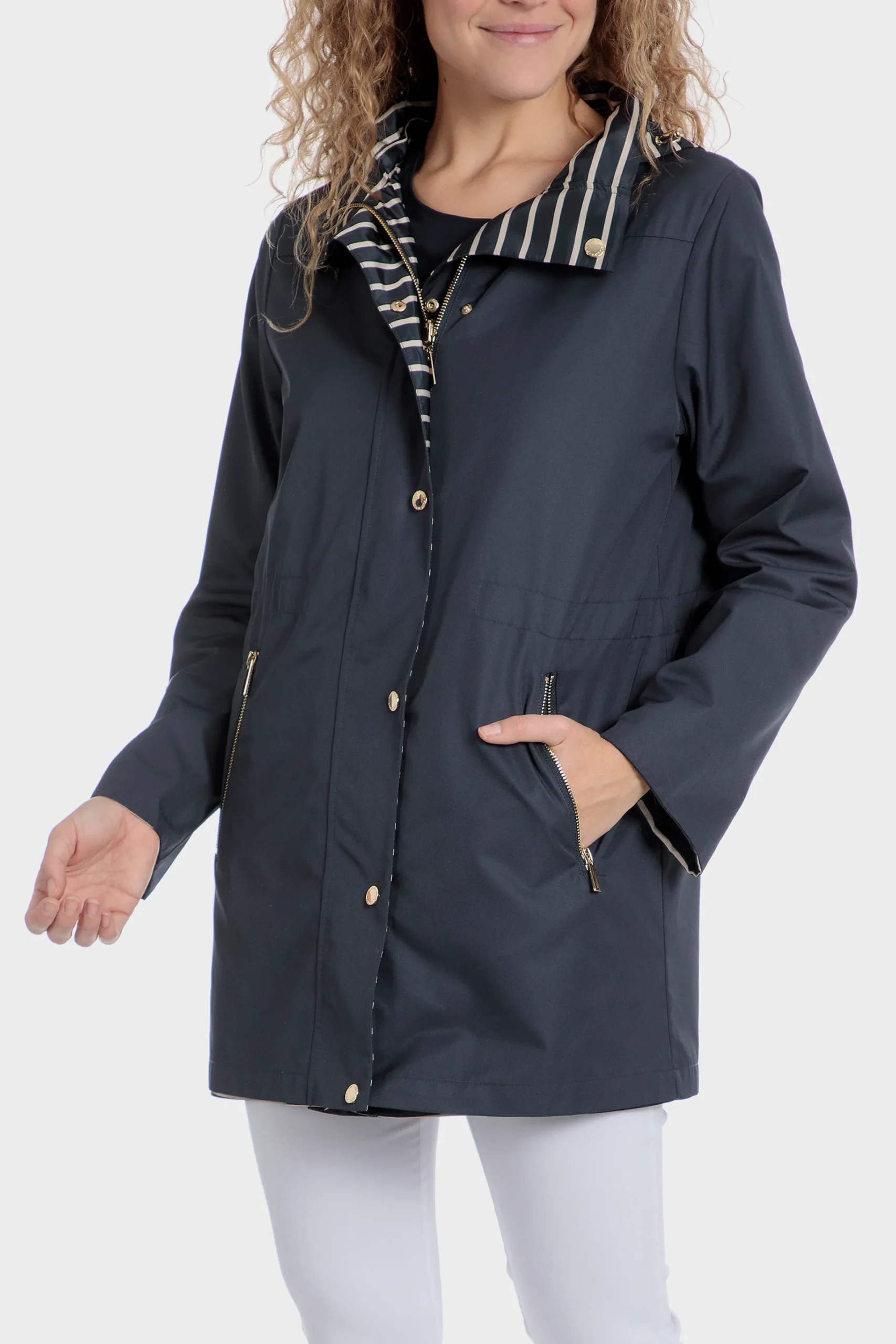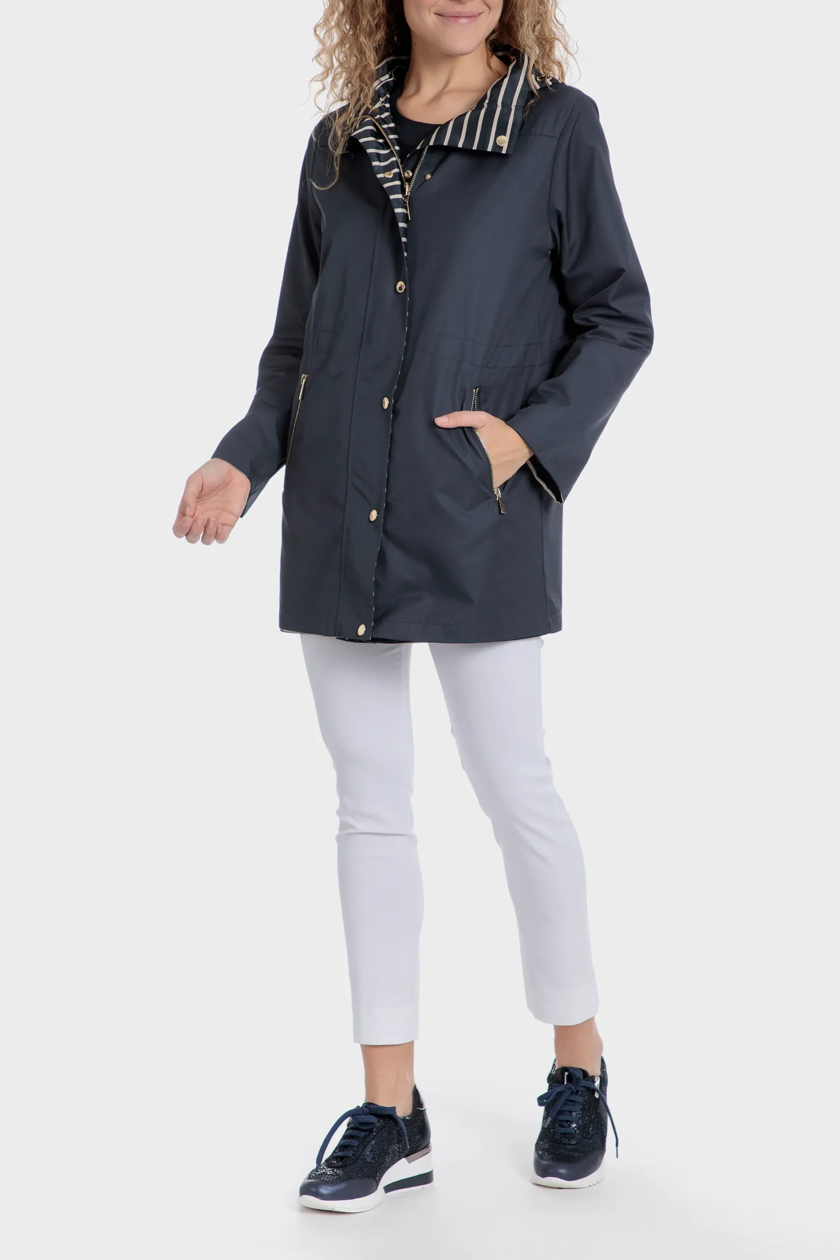 Parka réversible; deux poches latérales; capuche; taille réglable; fermeture zippée et boutons.