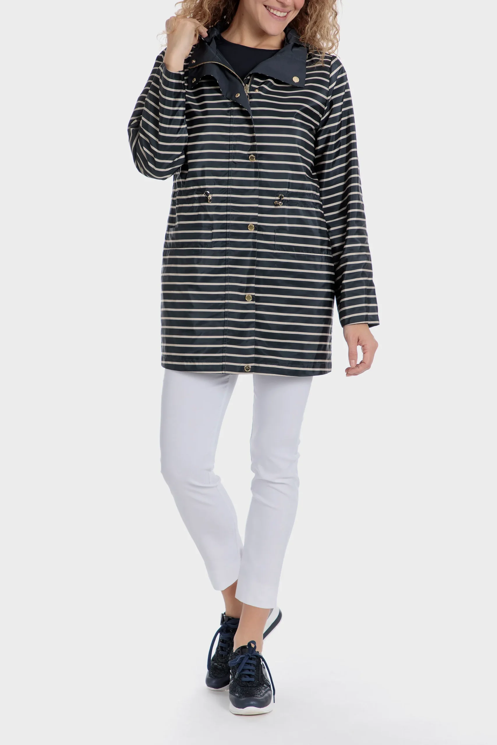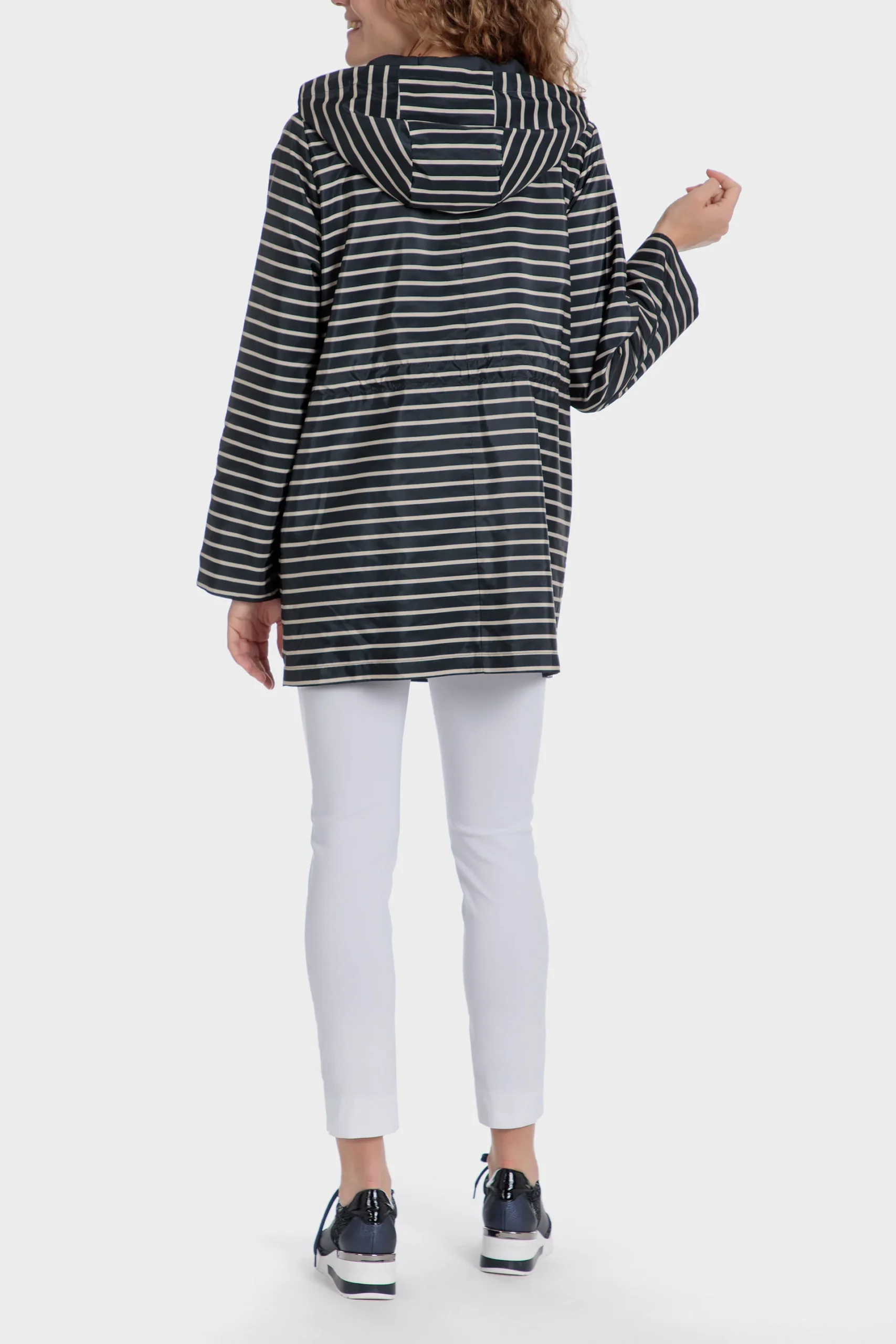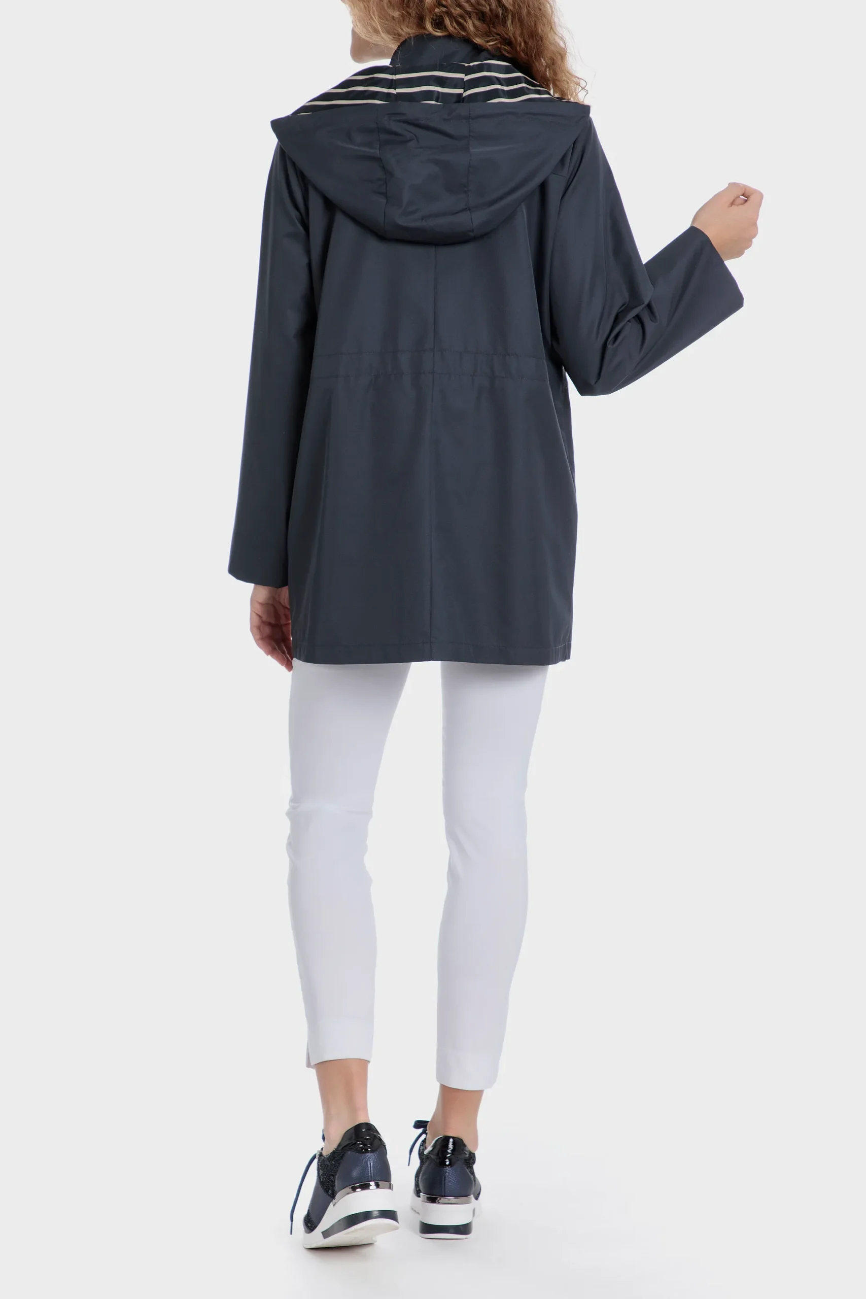Parka réversible; deux poches latérales; capuche; taille réglable; fermeture zippée et boutons.