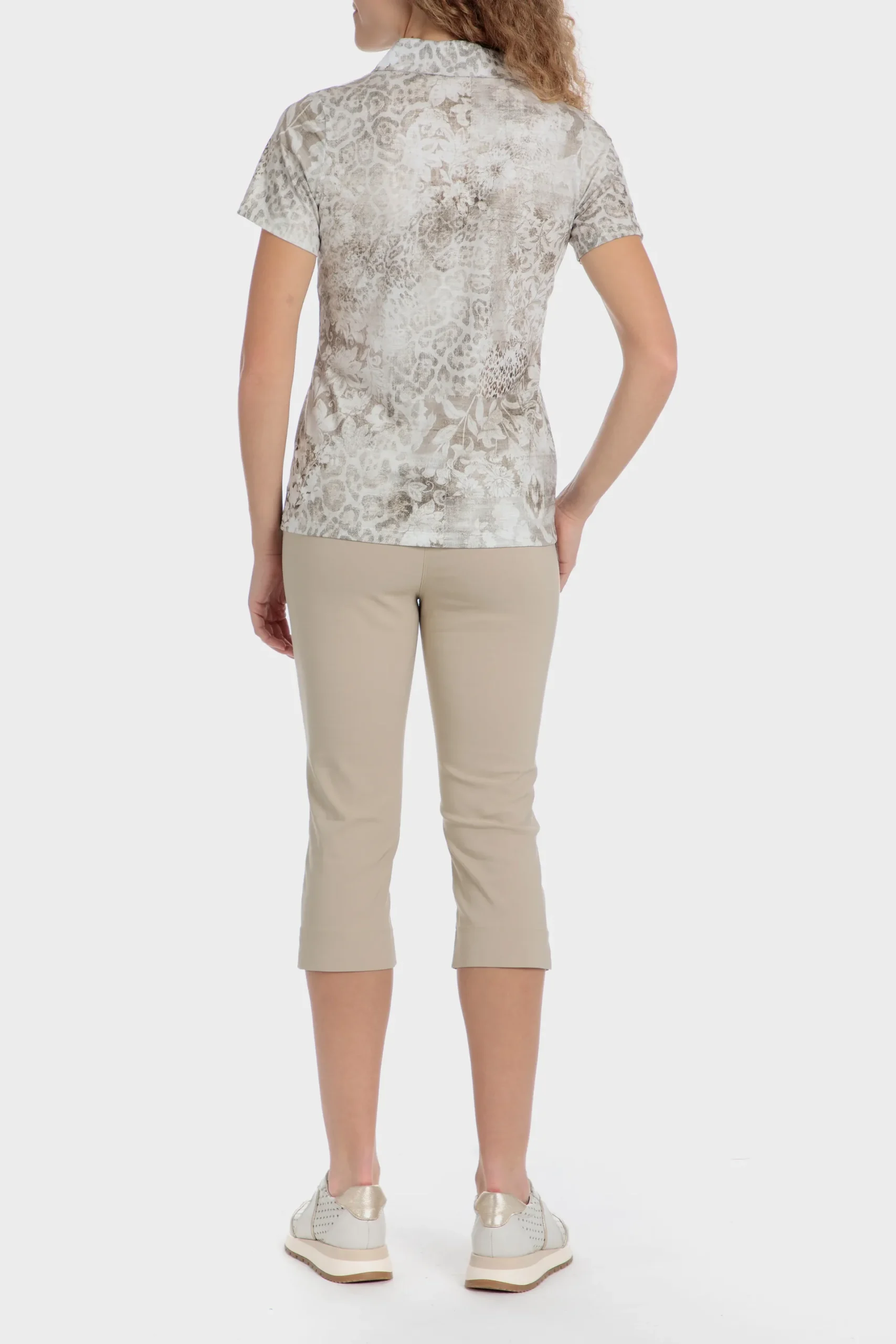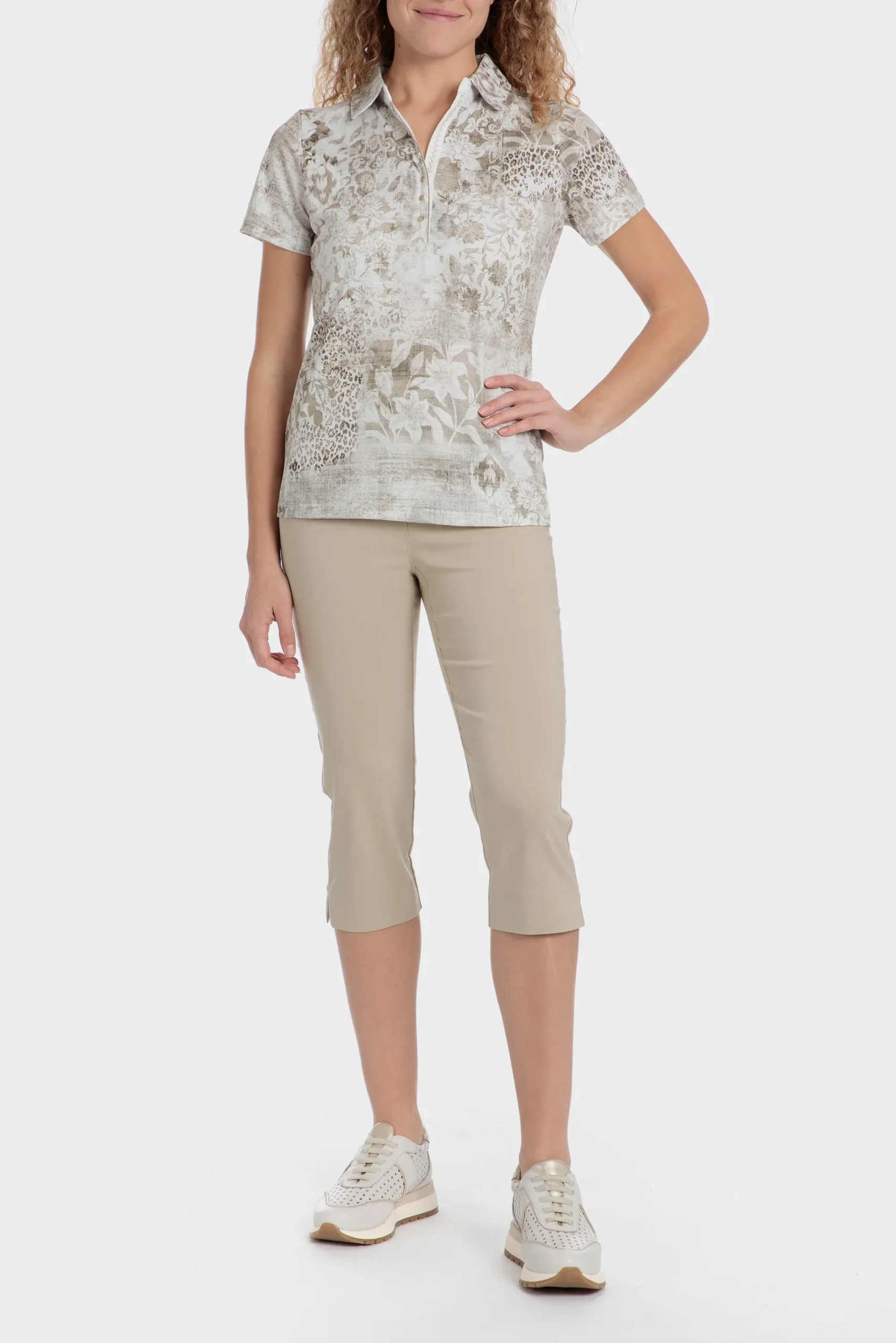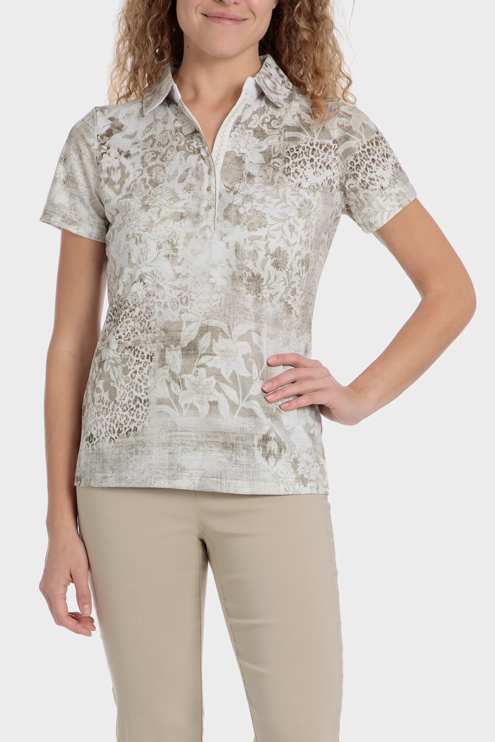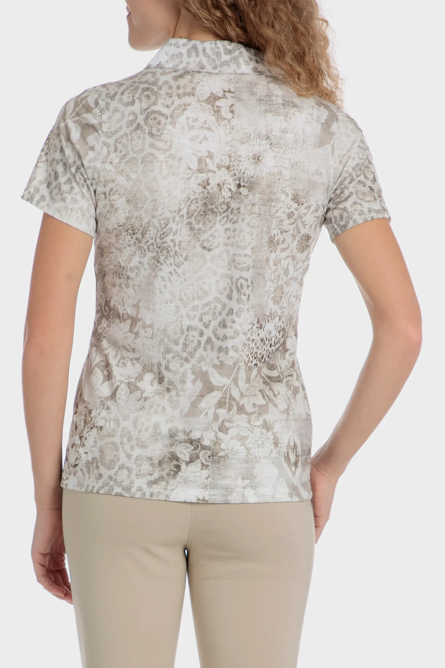 Polo; imprimé animal; boutons sur le décolleté; manches courtes.