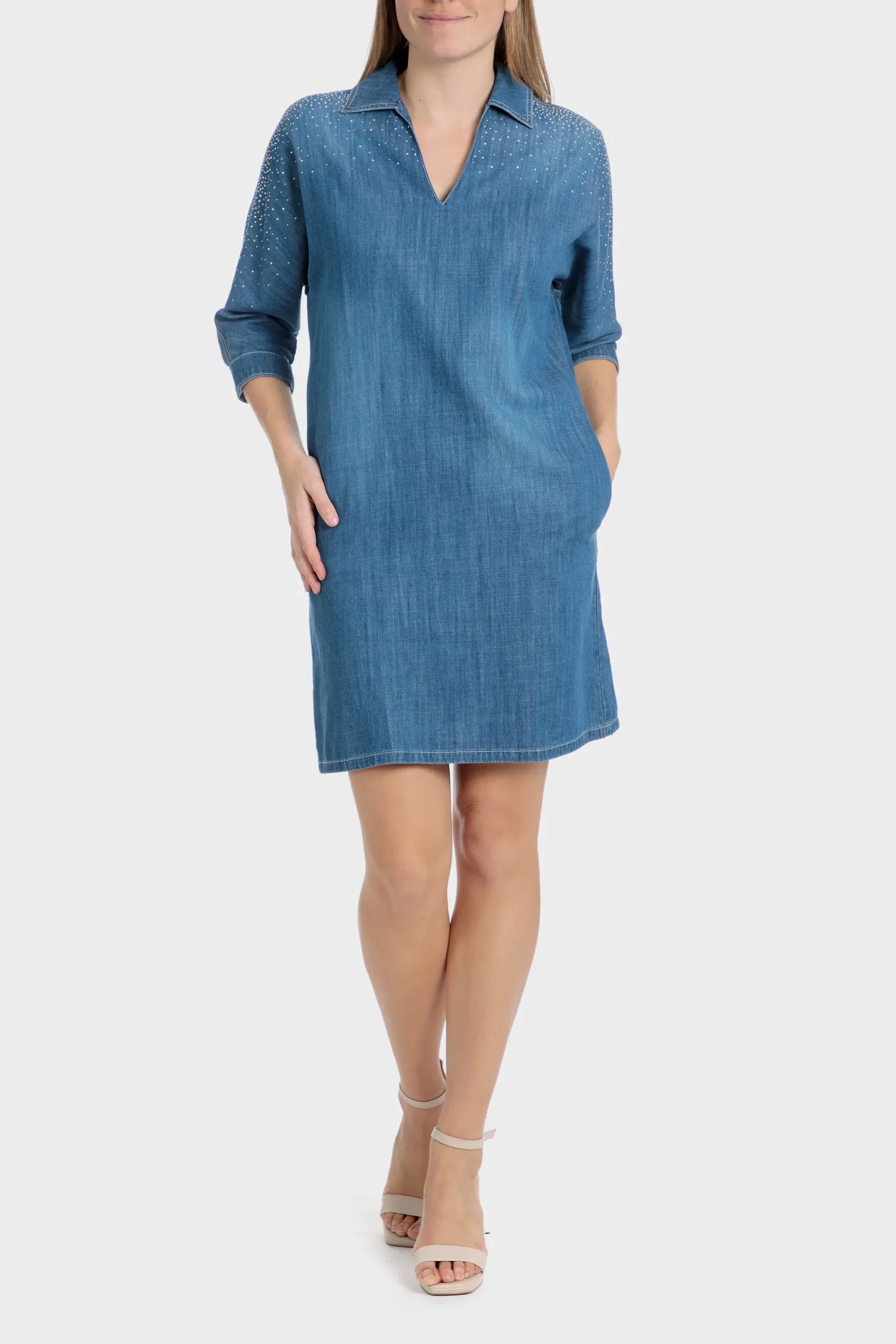 Robe chambray; détails de strass; décolleté en v; col chemisier; manches 3/4.