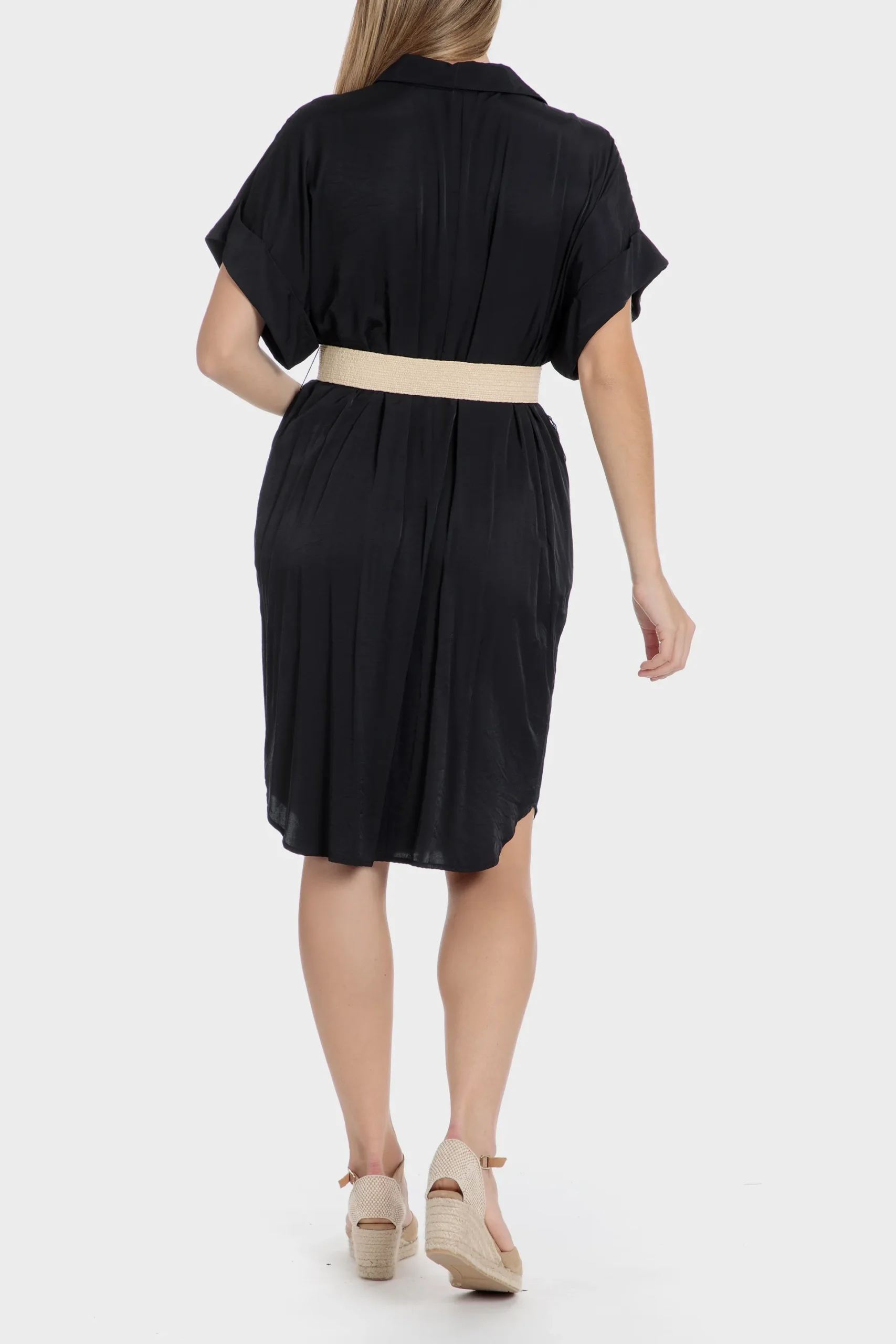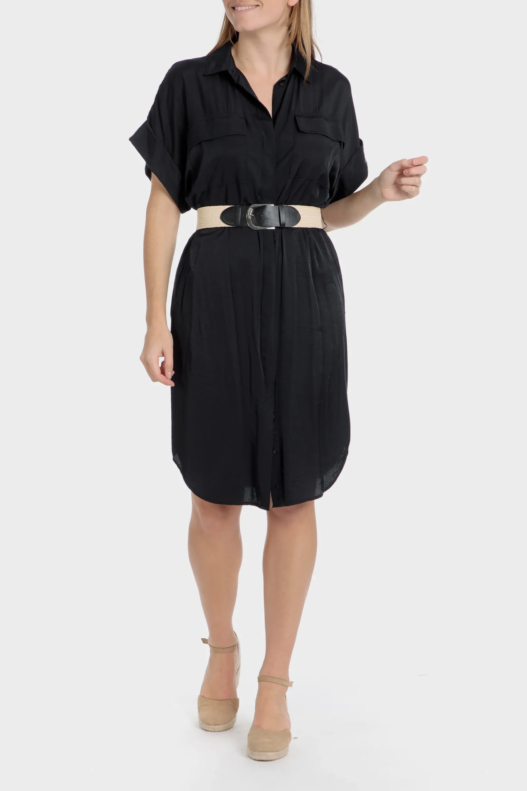 Robe chemisier noire; quatre poches; ceinture assortie; manches courtes.