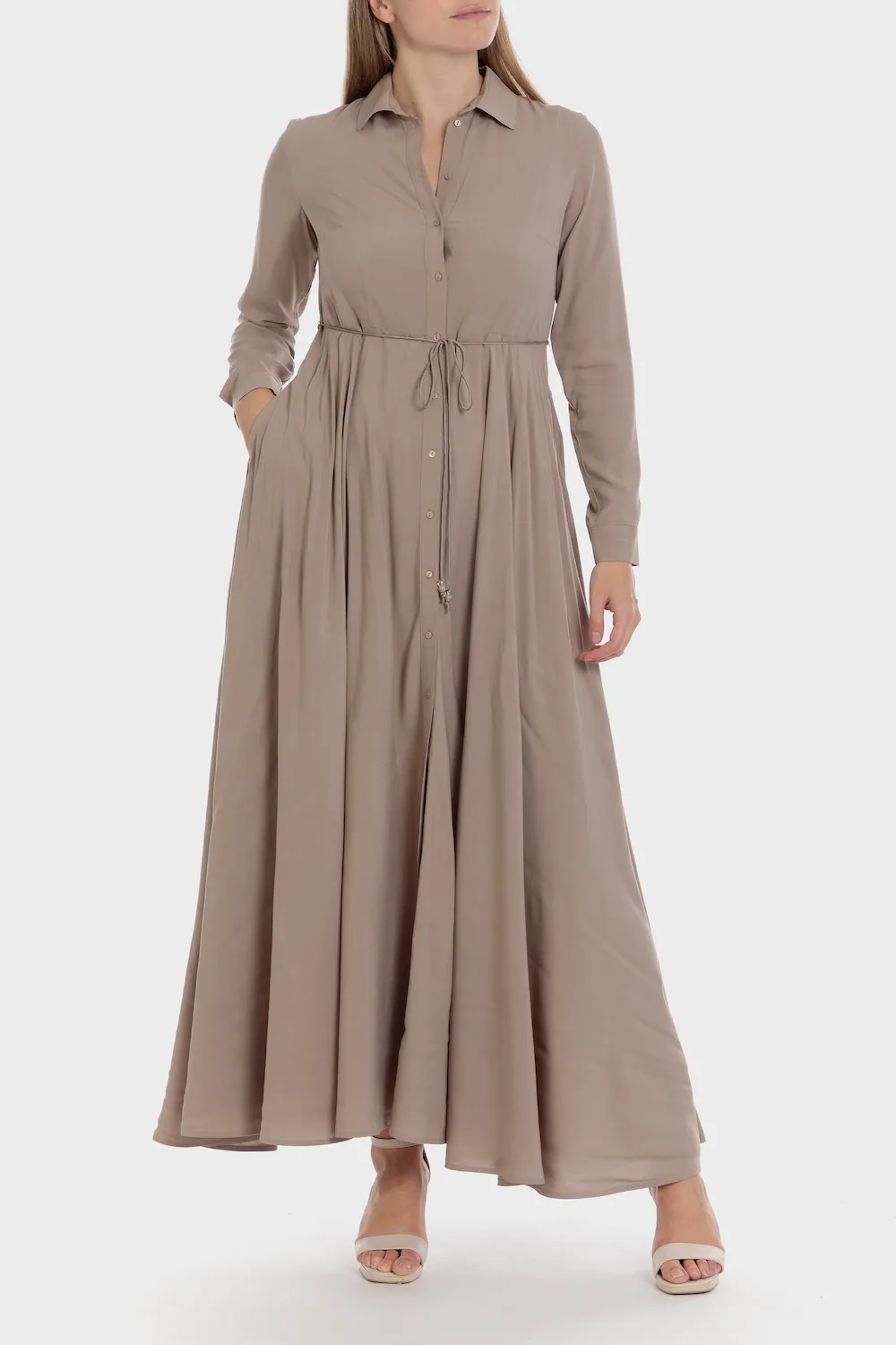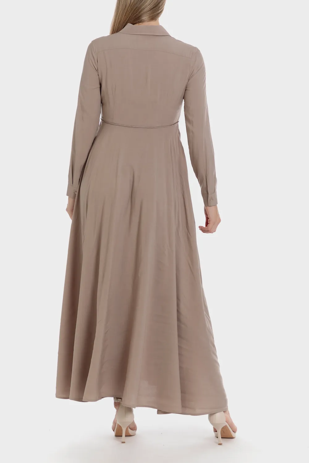 Robe longue, ceinture assortie, col chemisier, manches longues et poignets boutonnés, fermeture boutonnée sur le devant. Disponible dans plusieurs couleurs, tissu durable.
