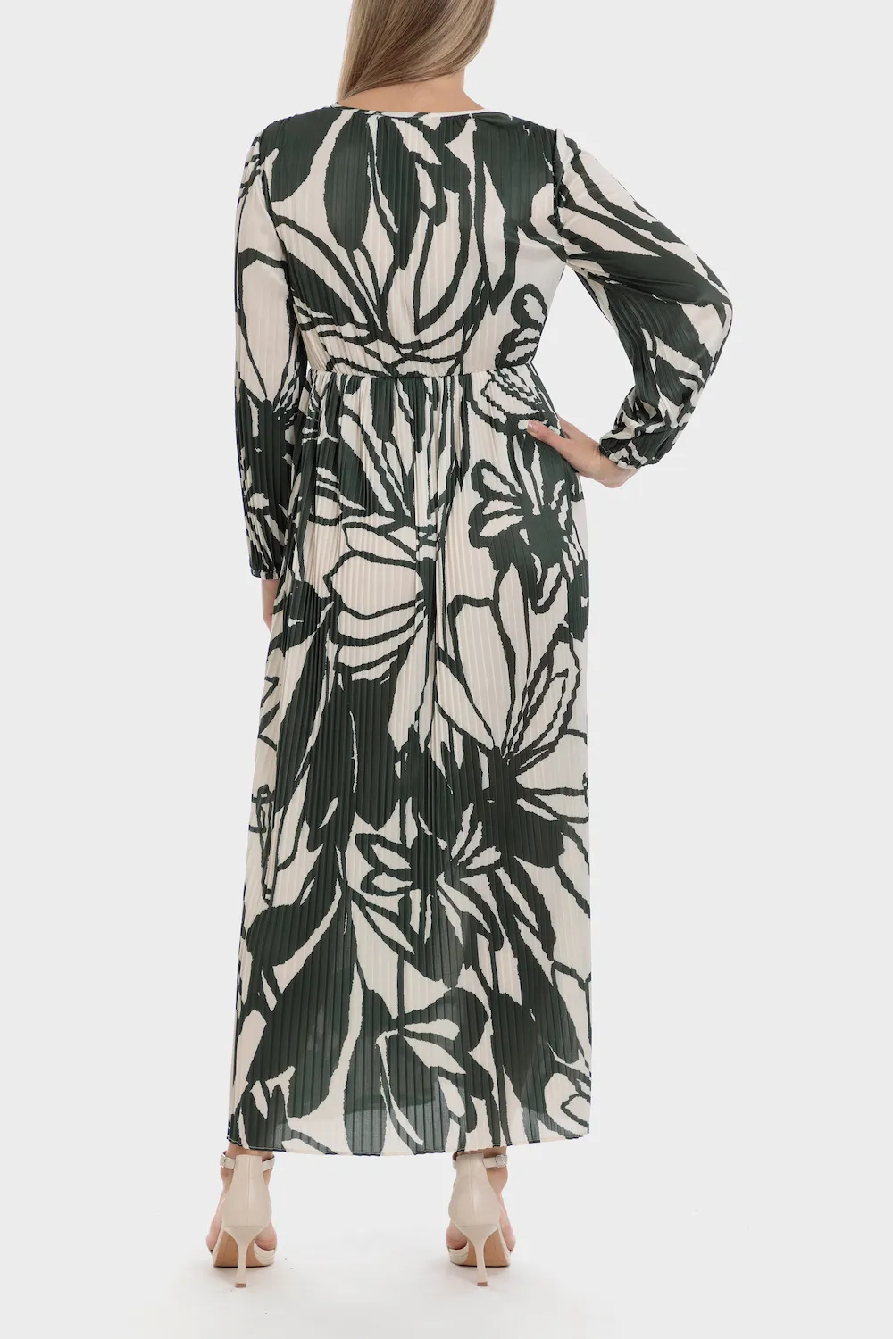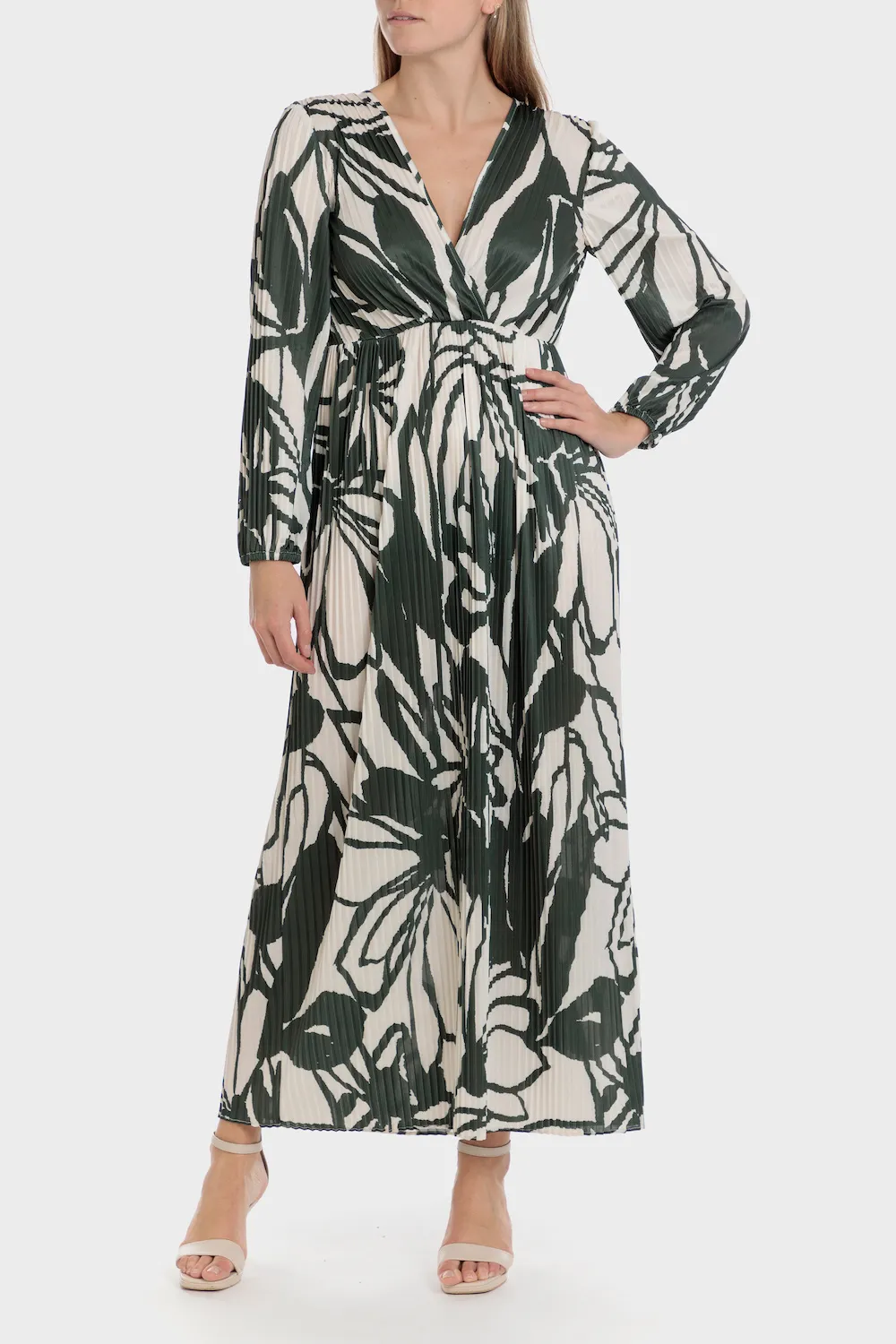 Robe imprimée, plissé, décolleté en v, manches longues et poignets élastiques.