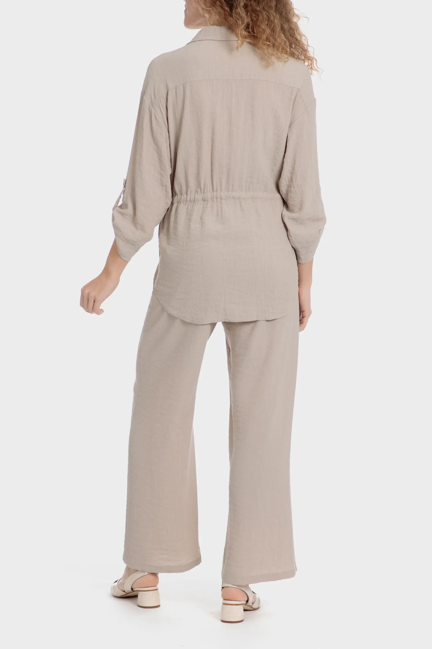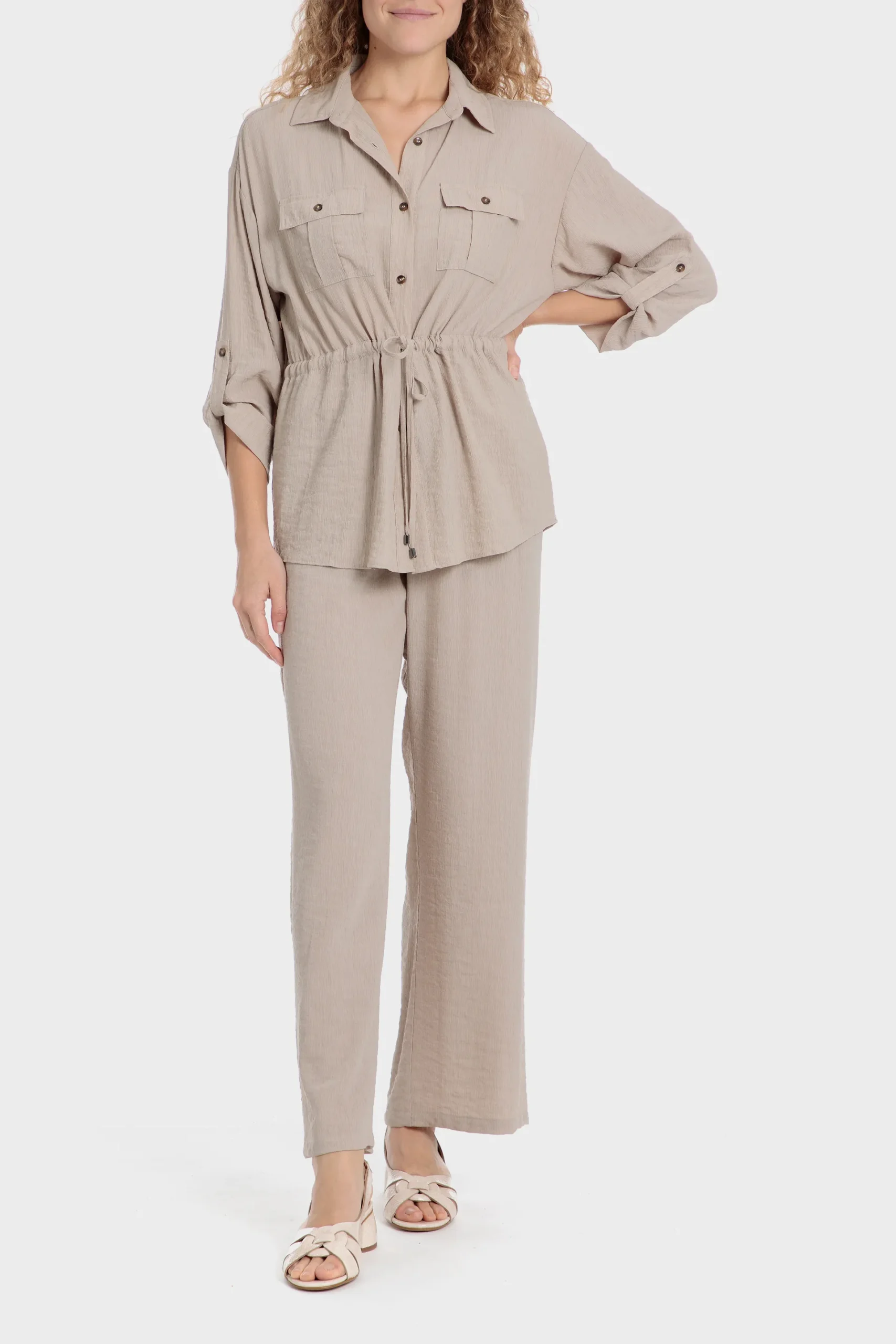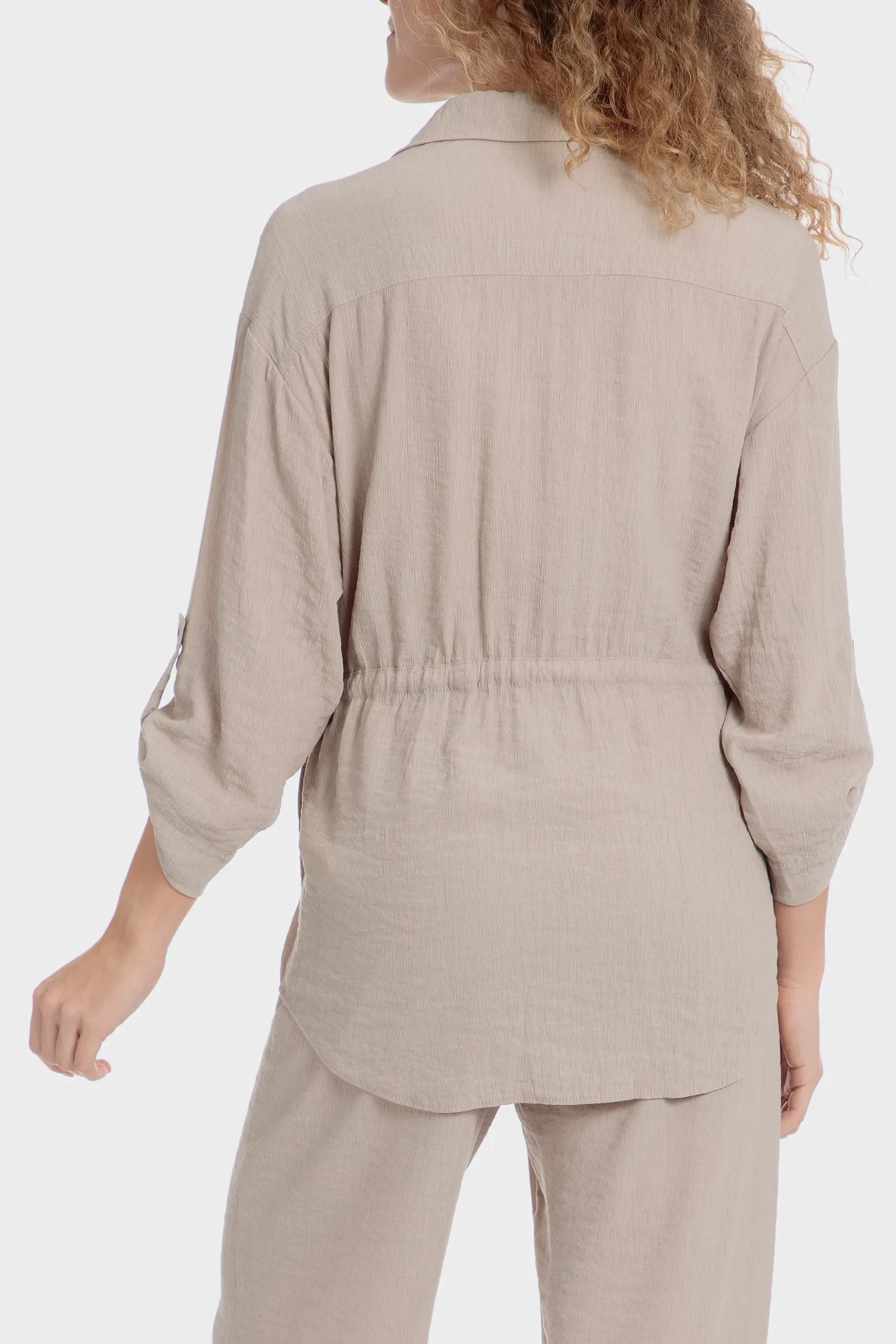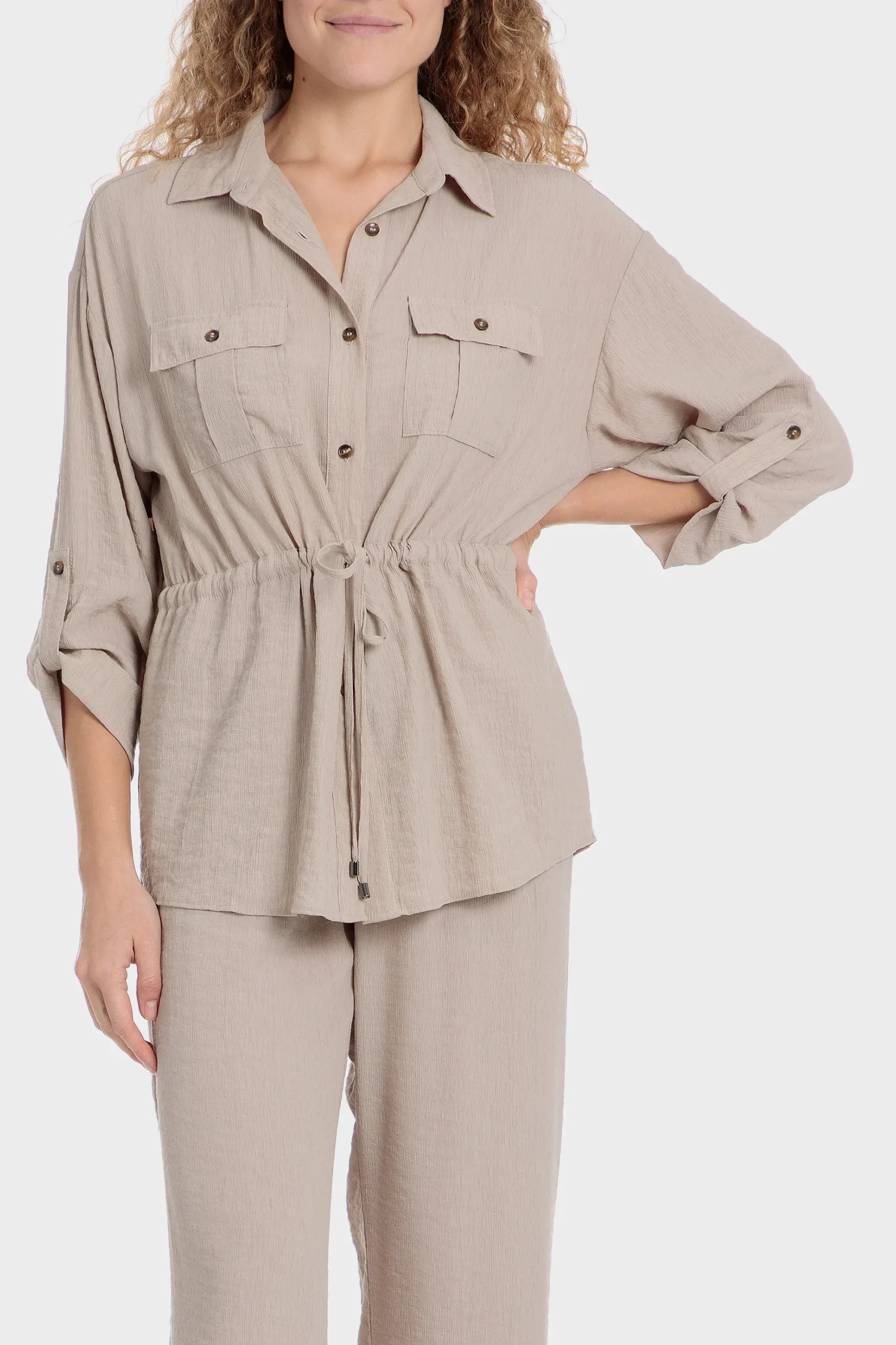 Surchemise marron; cordon réglable à la taille; deux poches avant; manches roll-up; fermeture boutonnée sur le devant.