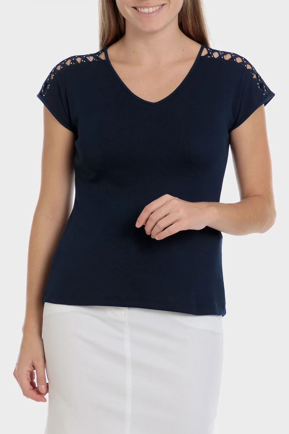 T-shirt basique, détails de clous, manches courtes, col en v. Disponible dans plusieurs couleurs.