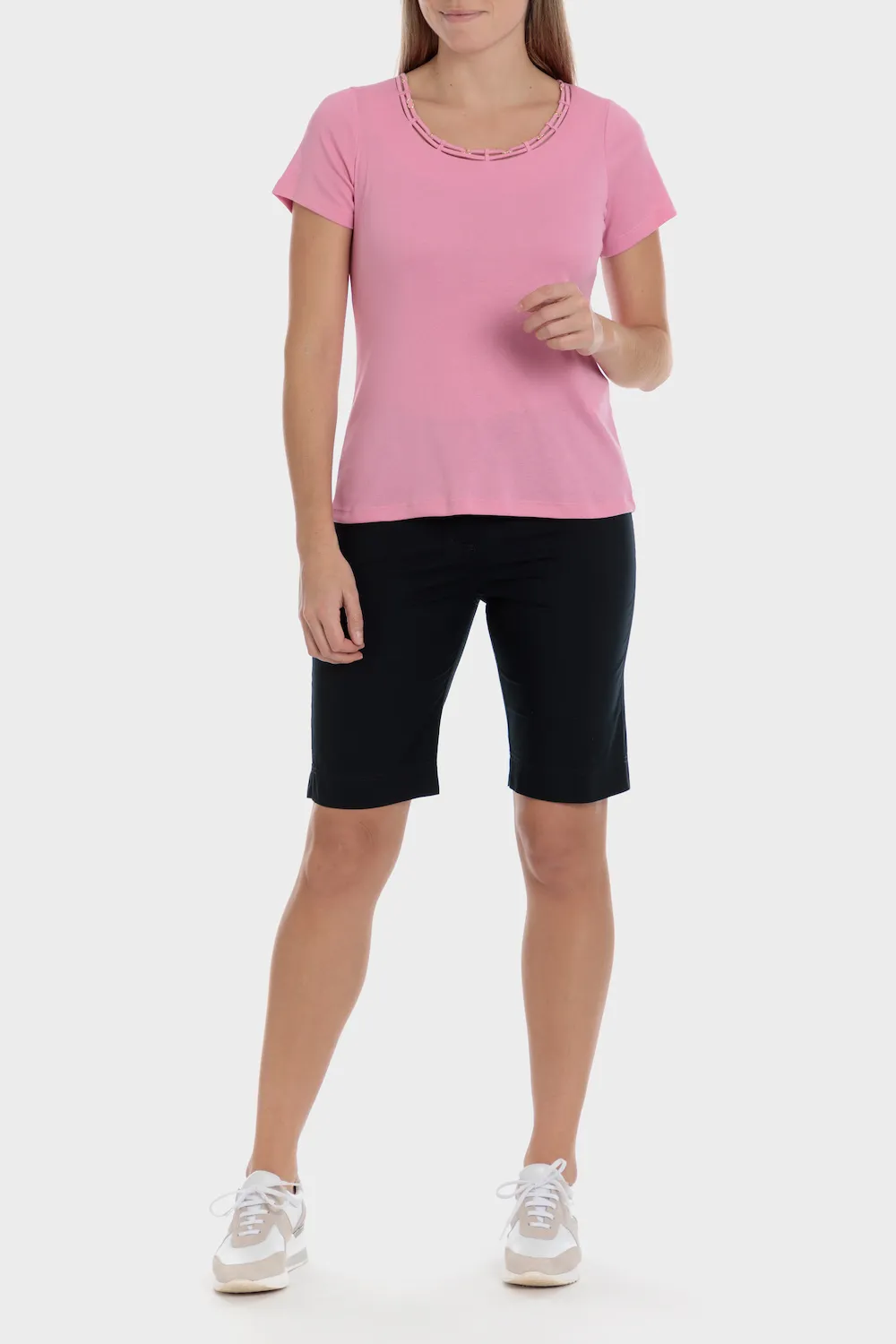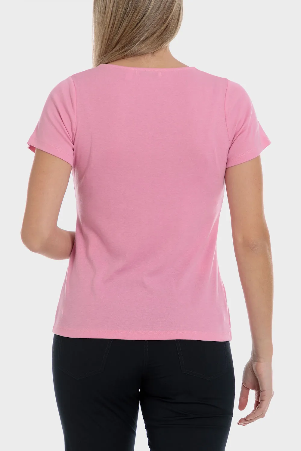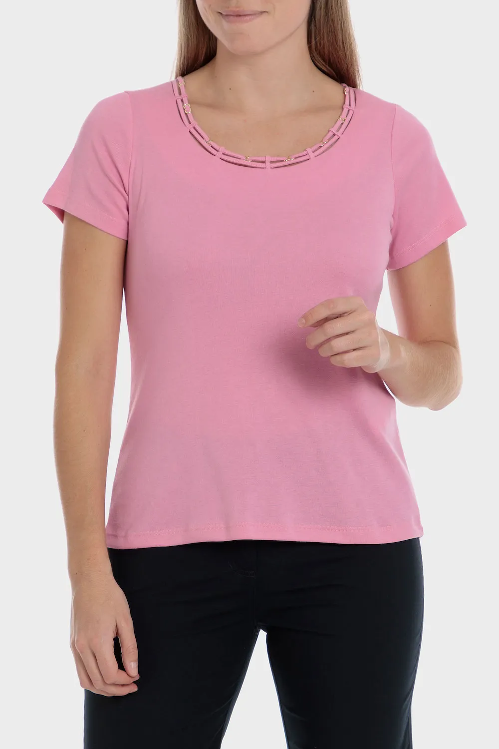 T-shirt basique, détails fantaisie, manches courtes, col rond. Disponible dans plusieurs couleurs.