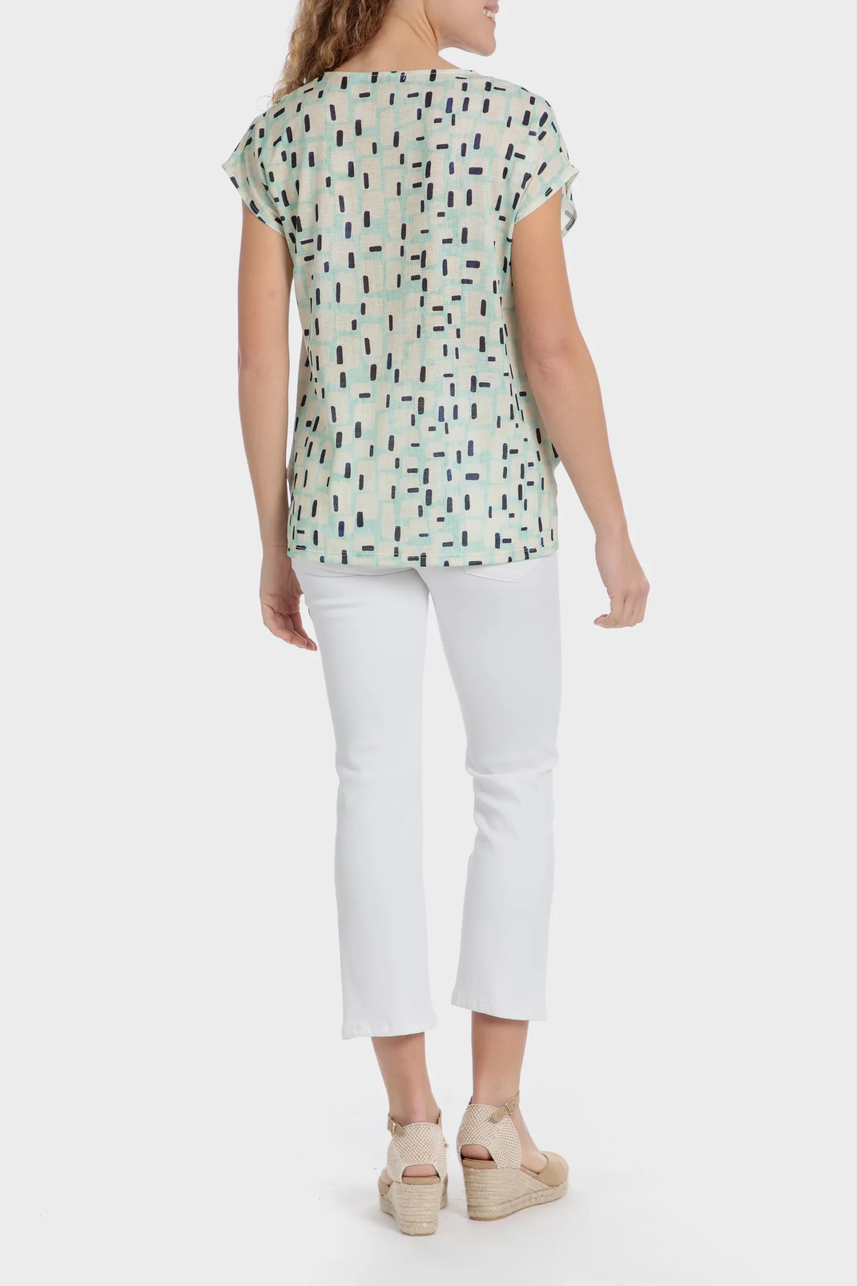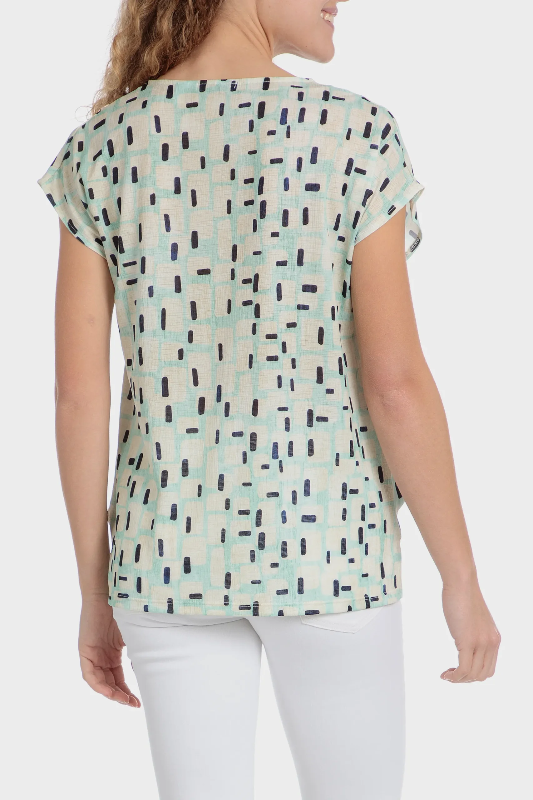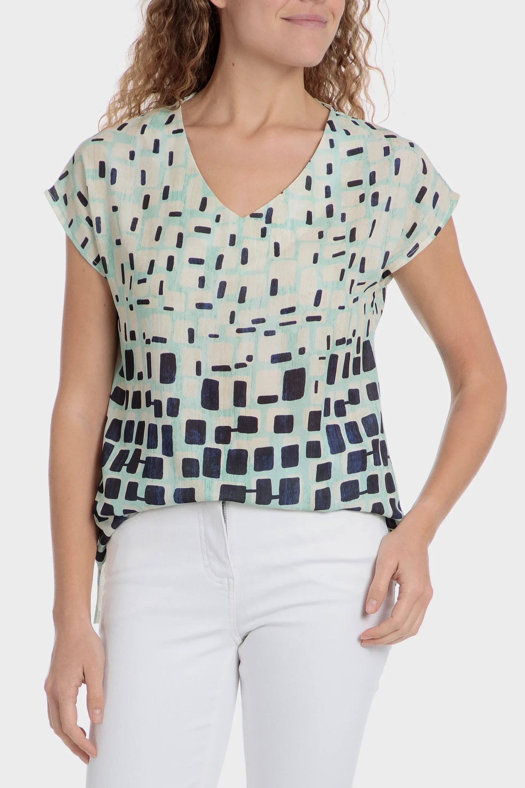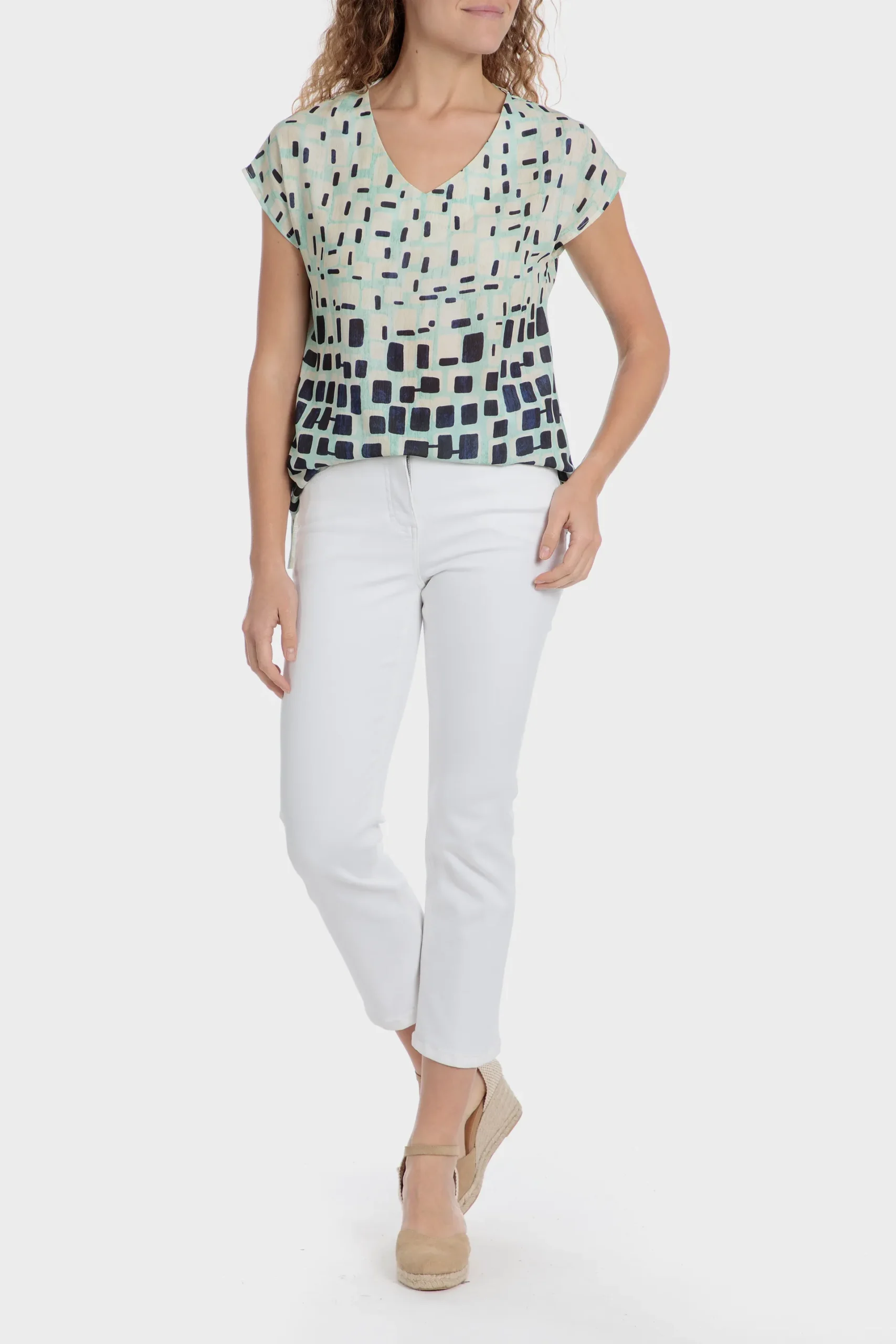 T-shirt imprimé géométrique; décolleté en v; manches courtes.
