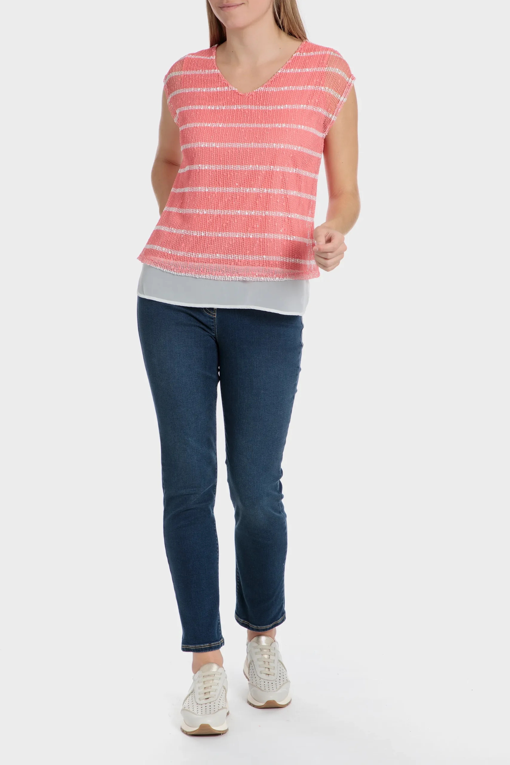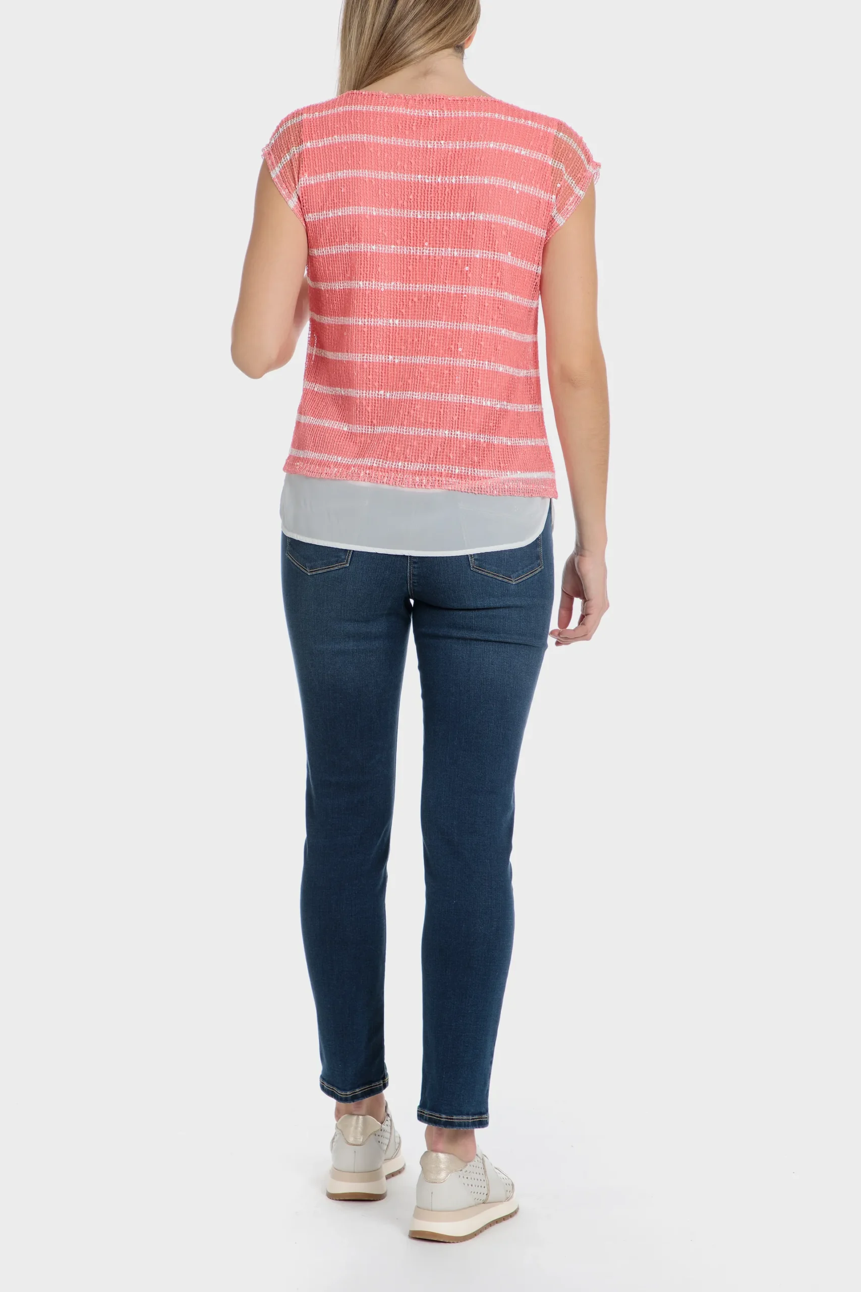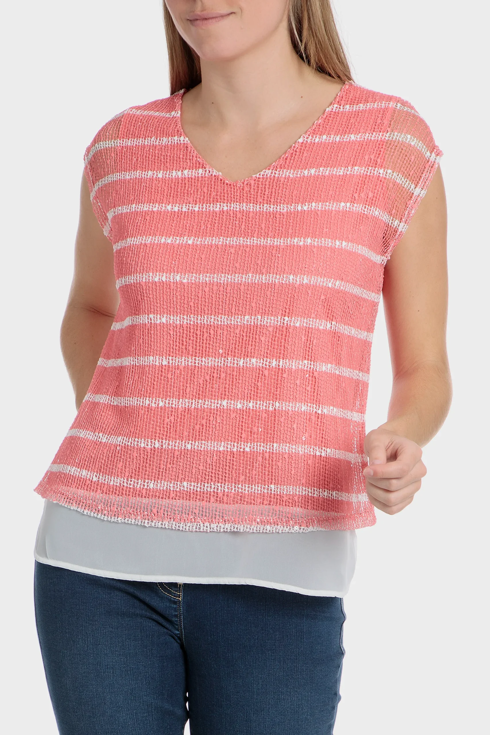 T-shirt résille; détails de sequins; décolleté en v; manches courtes.