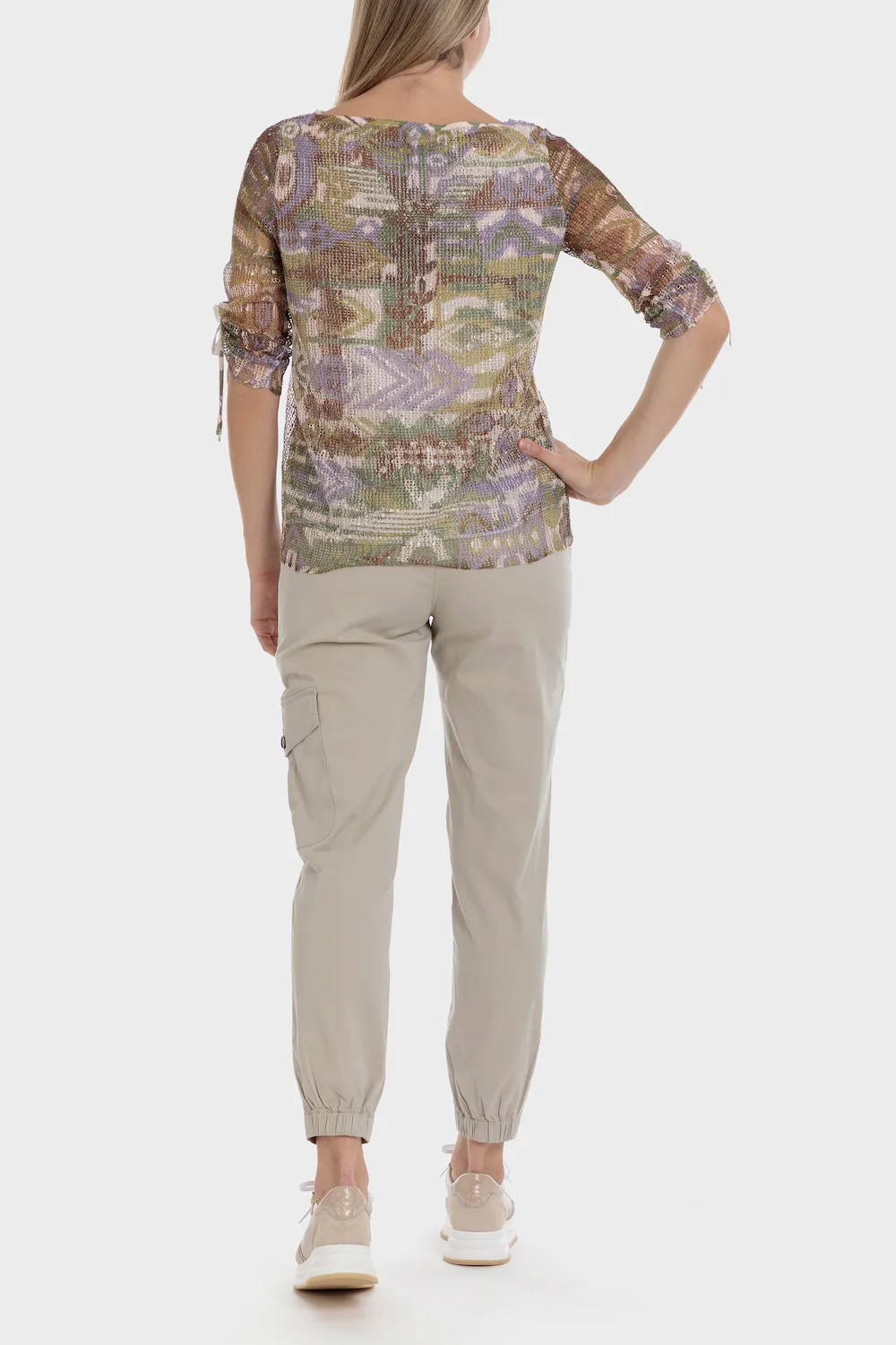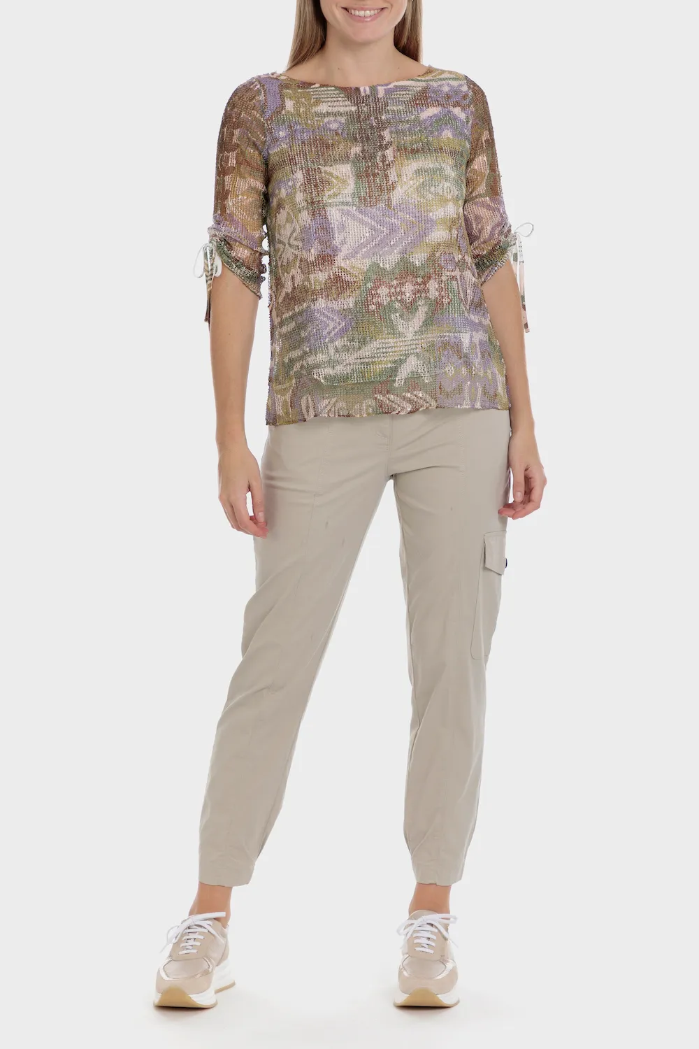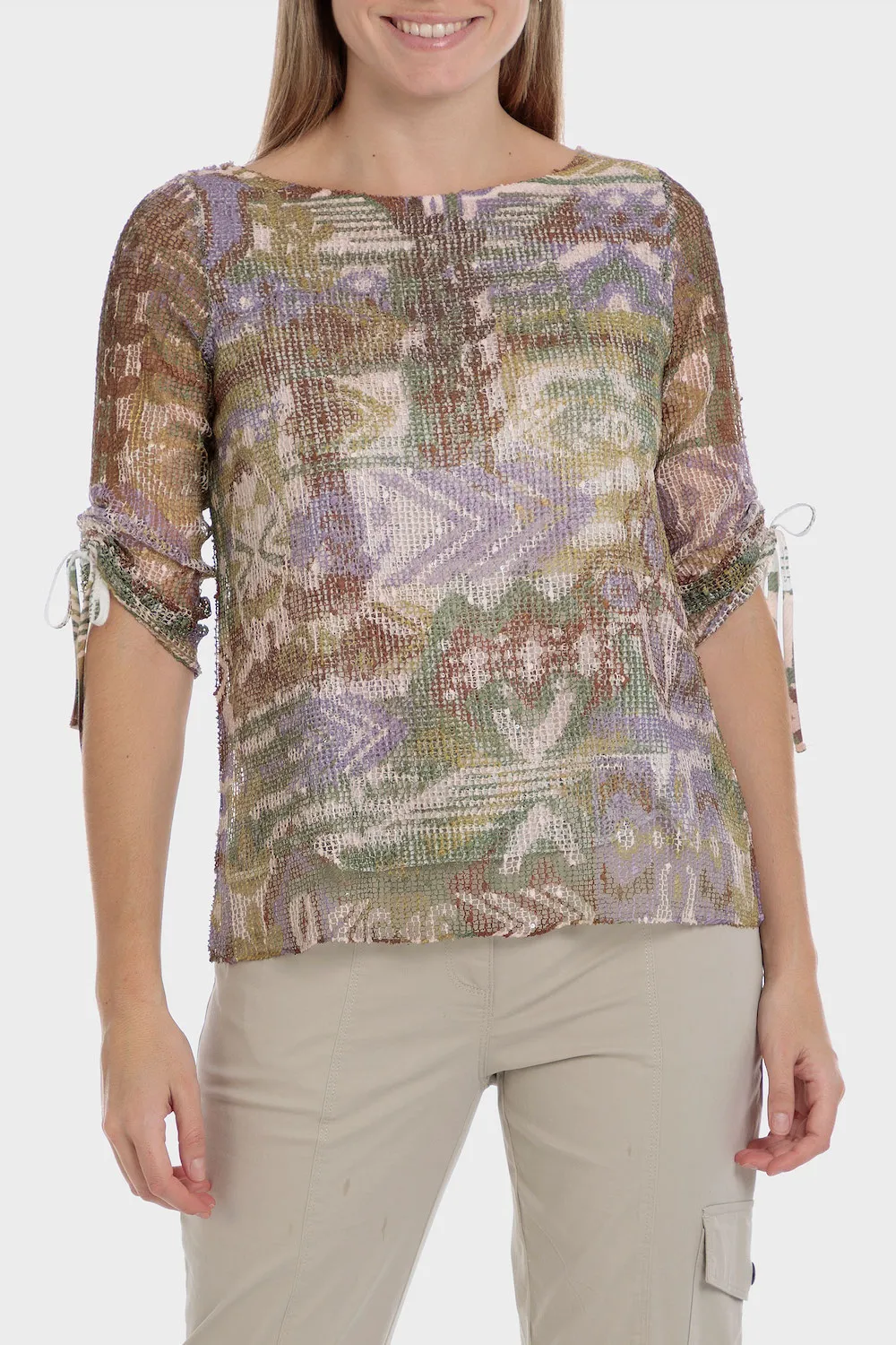 T-shirt résille, imprimée, détail de sequins, col rond, manches longues et nœud aux poignets.