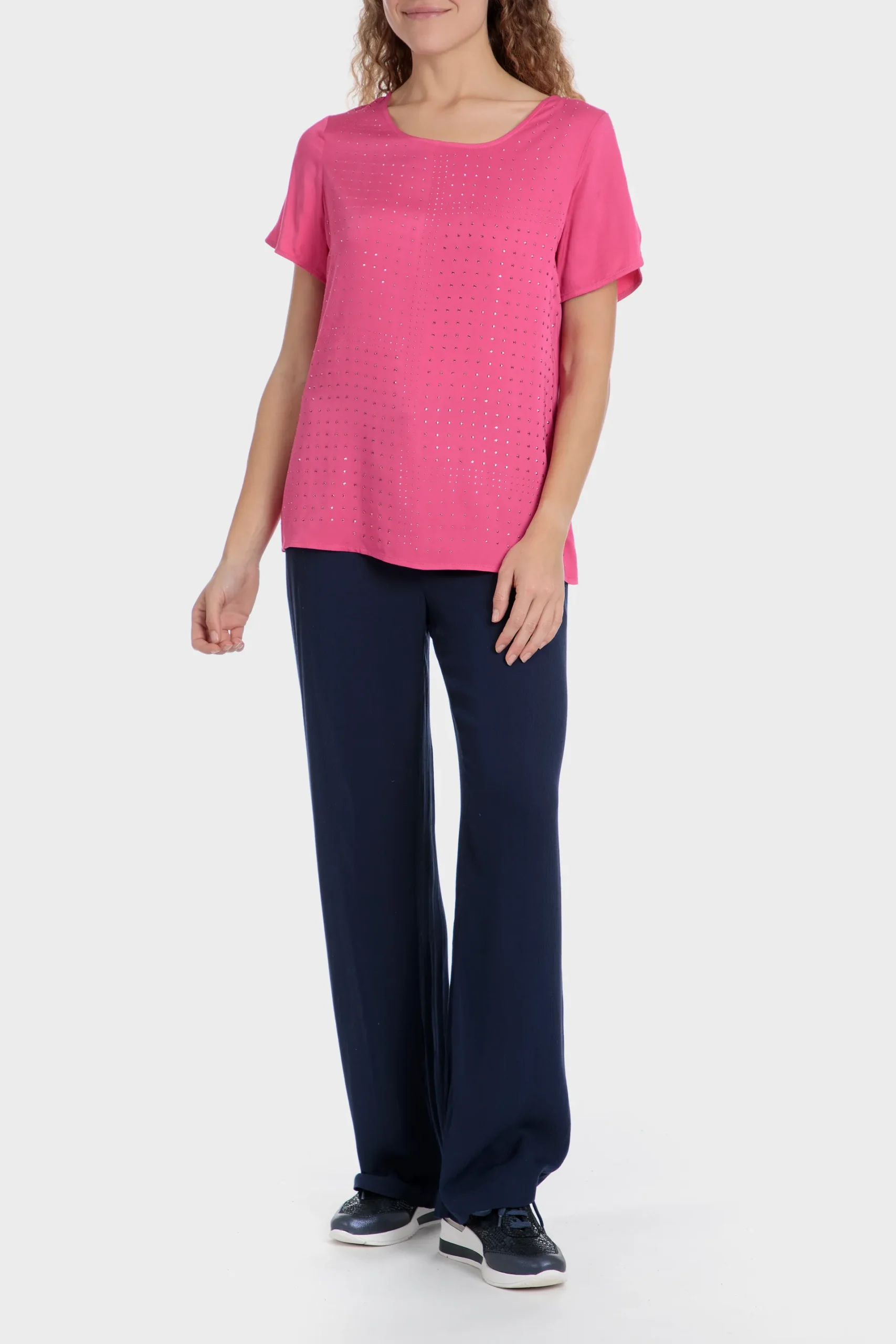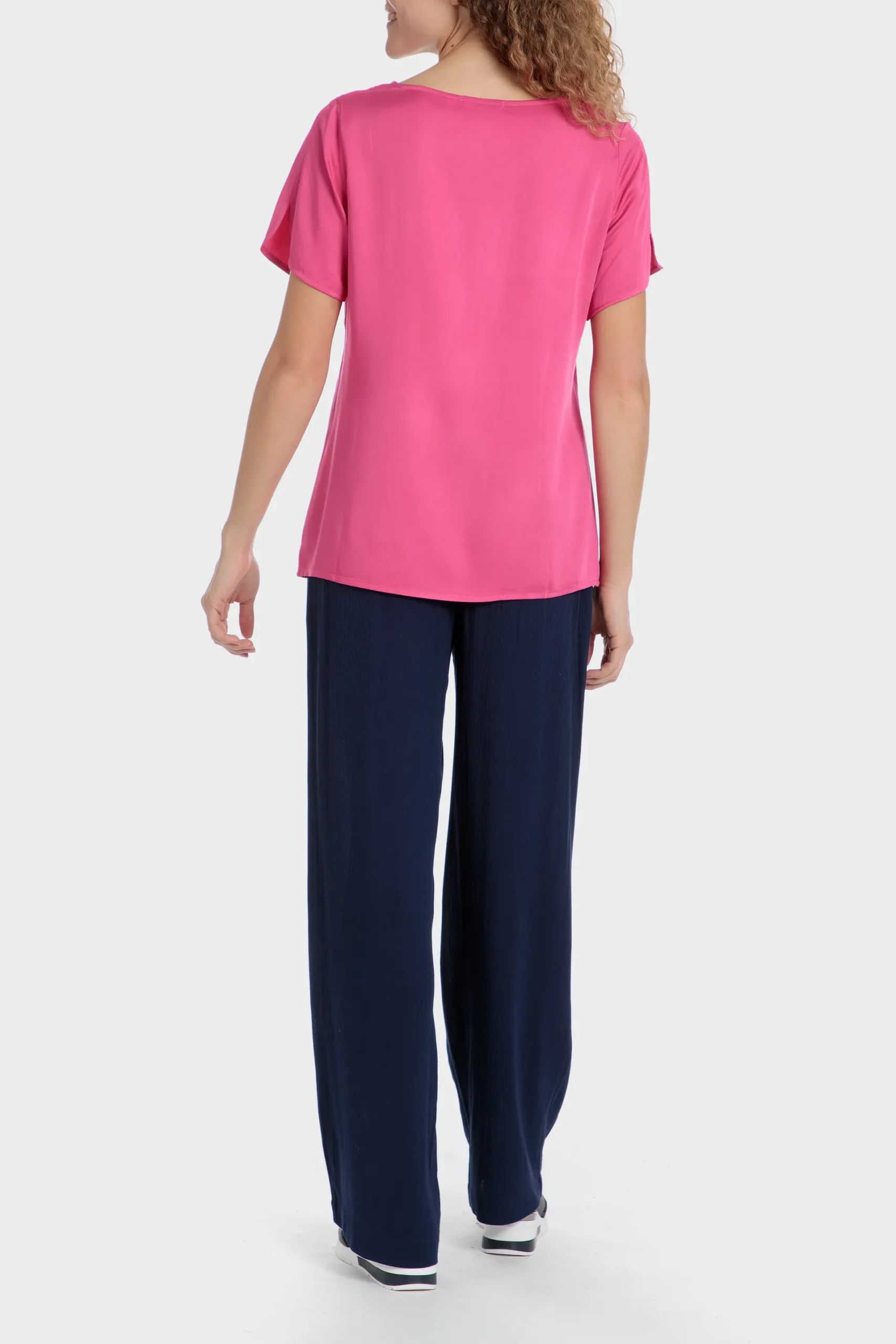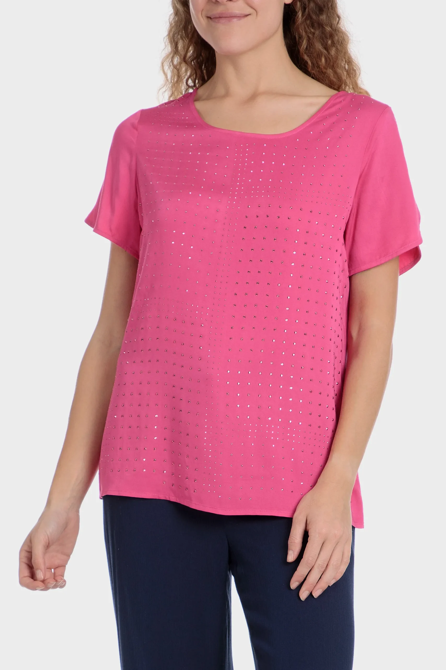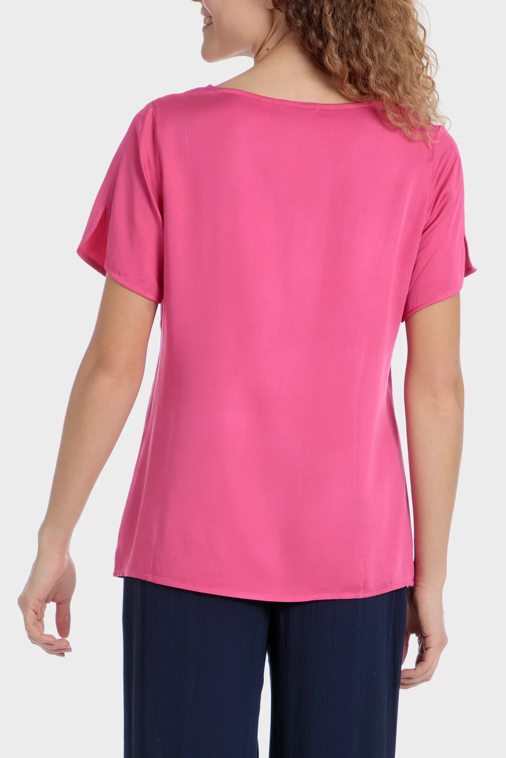 Top fuchsia; détails fantaisie; col rond; manches courtes.