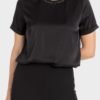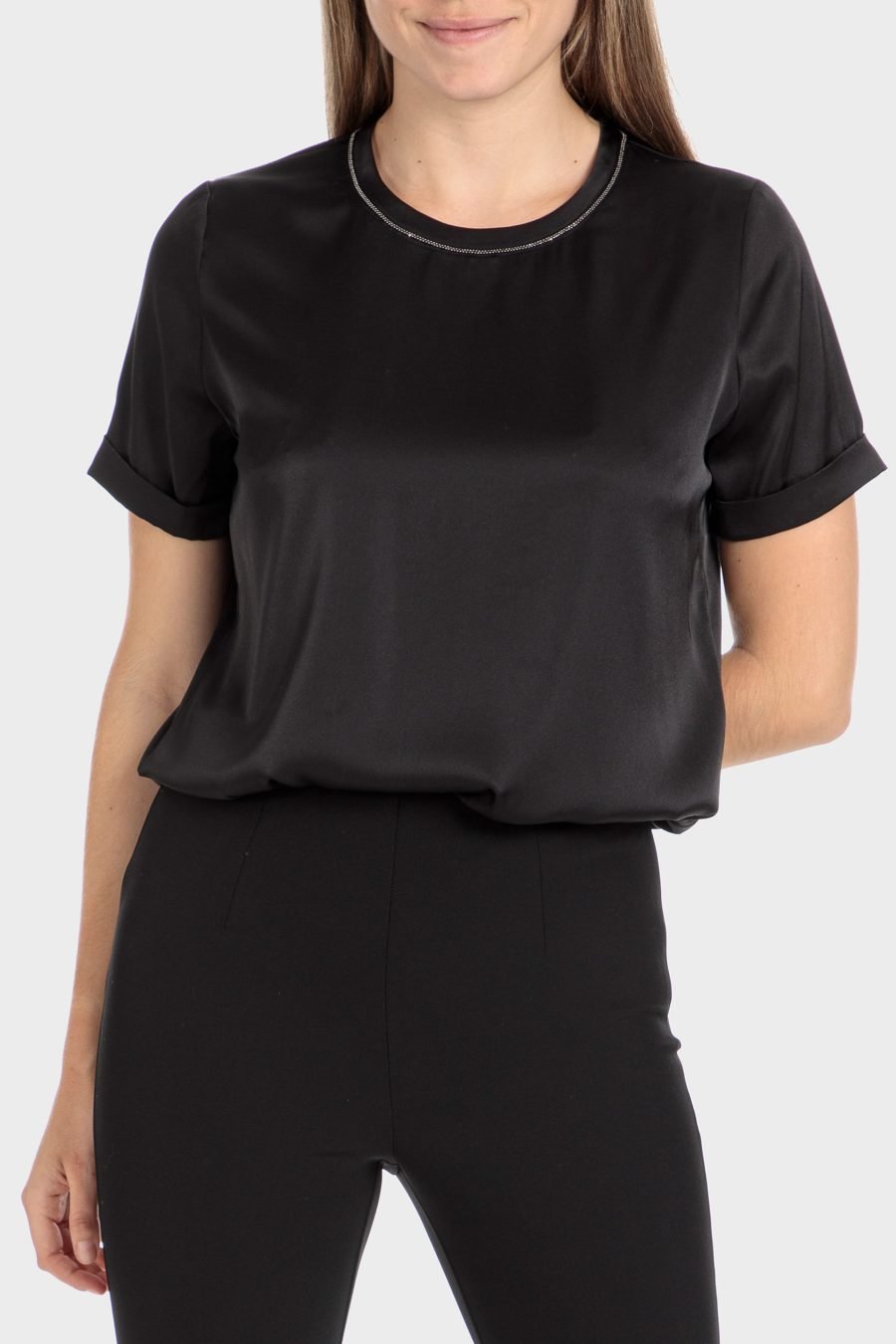 Top noir, chaîne, manches courtes, fermeture par bouton à l’arrière.