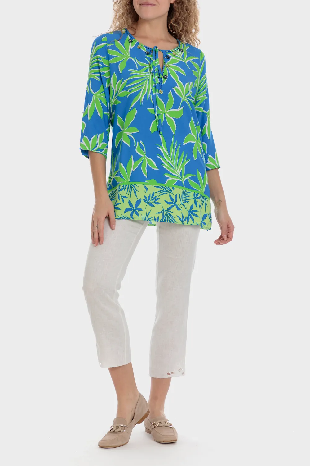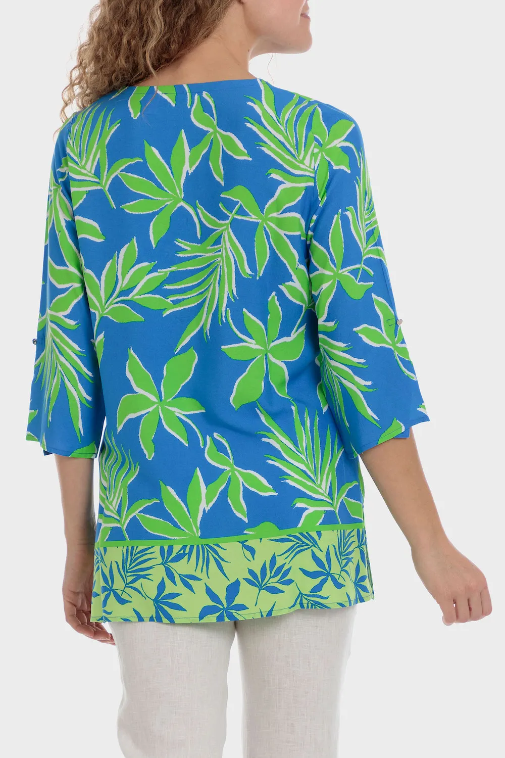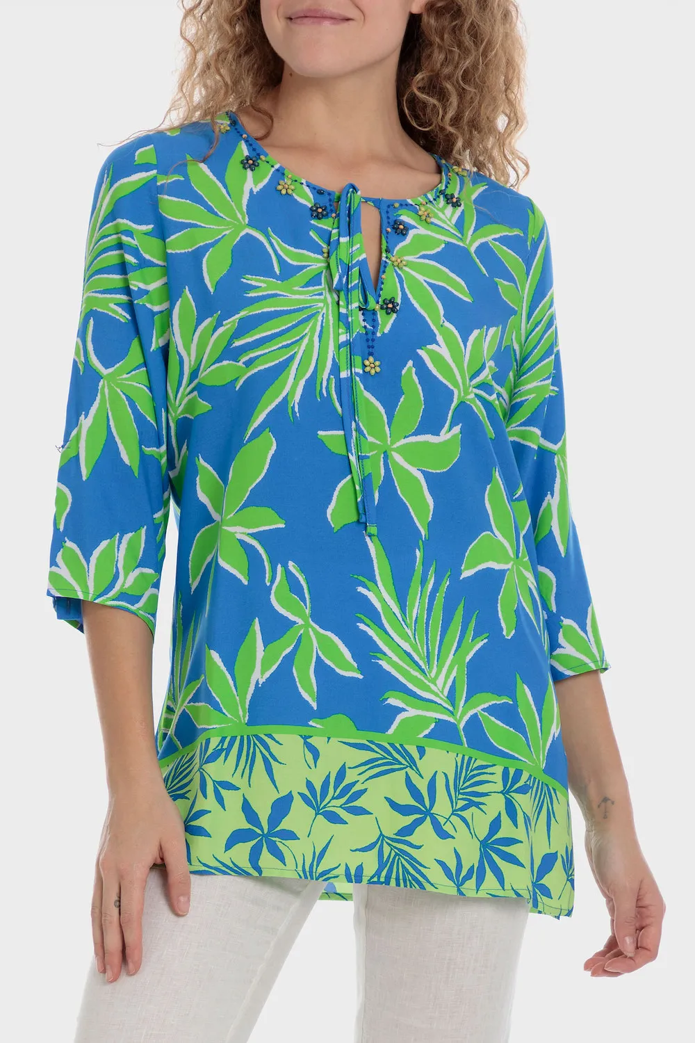 Tunique imprimée, fentes latérales, détails fantaisie, décolleté larme, manches roll-up.